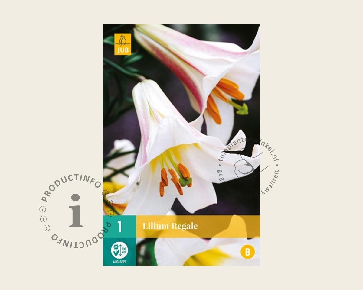 De Lilium regale geeft elegante exotische witte bloemen. Als de bloemknoppen dicht zijn hebben deze een roze/rode kleur. Maar er zijn onder de lelies veel kleuren verkrijgbaar, zoals in roze tinten en subtiele geel tot oranje. De bloemen zijn over het algemeen altijd geurend. Een lelie staat graag in de zon. Het product is leverbaar met 1 bol in de verpakking.