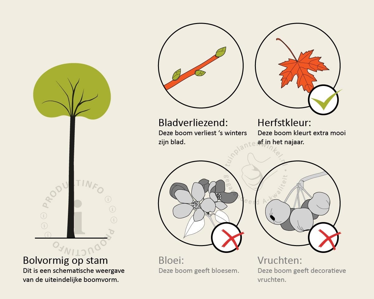 De uiteindelijke hoogte ligt een beetje aan de stamhoogte. U moet rekenen dat boven op de stamhoogte nog een kroon gevormd gaat worden van ongeveer 100 cm. Vandaar dat de boom zeer goed past in grotere en kleinere tuinen en in een landelijke tuin. Zelfs in een kleine stadstuin is deze boom toe te passen.