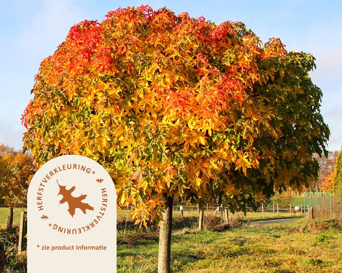 Het blad van deze Amberboom op stam verkleurt in het najaar. De kleuren op de foto geven een indicatie van deze verkleuring. De exacte verkleuring is afhankelijk van de standplaats en het weer en kan per jaar verschillen. Het is dus niet zeker of u de verkleuring zoals deze gefotografeerd is, ook terugziet in uw tuin. Aan de kleuren die op deze foto zichtbaar zijn, kunnen geen rechten worden ontleent.