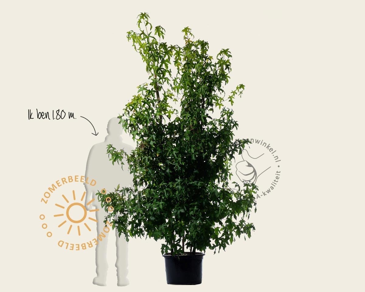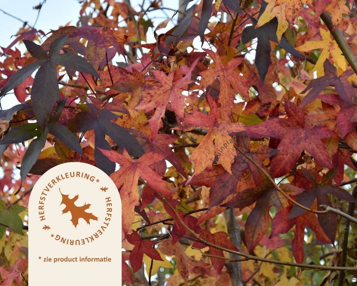 De Liquidambar styraciflua heeft meerdere stammen, waardoor de boom vanaf de grond al een iets bredere groeiwijze heeft. Met name in de herfst is deze Amberboom prachtig om te zien. Het diep ingesneden, groene blad zal verkleuren naar rood, geel, oranje en zelfs paars. Uiteindelijk zal het blad van de boom vallen, waarna in het voorjaar het hele schouwspel weer opnieuw begint. Op de bast verschijnen na verloop van tijd zeer mooie kurklijsten, waardoor er in de bast diepe groeven komen en de boom een robuust karakter krijgt. Deze tuinplant kan uiteindelijk 5 tot 10 meter hoog worden en komt daarom mooi tot zijn recht in de middelgrote tot grote tuin.