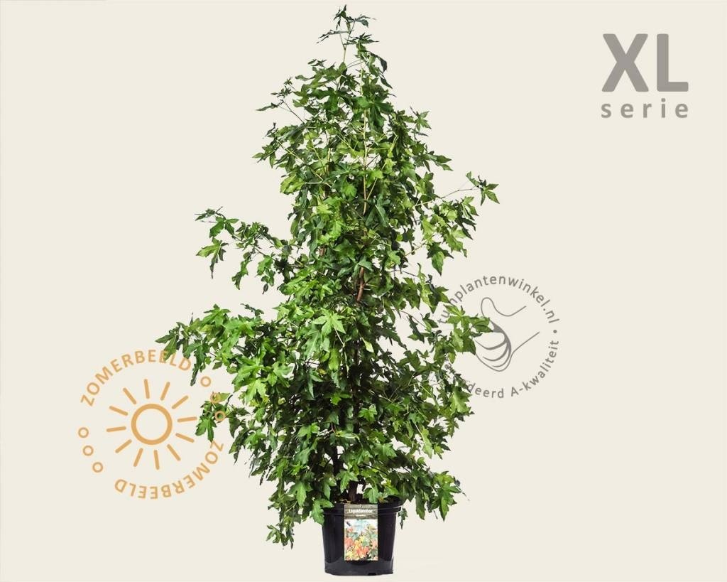 Liquidambar styraciflua - XL is een prachtige boom met diep ingesneden bladeren. De Amberboom krijgt mooie kurklijsten op de stam. Het mooiste bewaart de tuinplant voor de herfst als de bladeren verkleuren naar roodgeel tot oranjepaars. Samen met de esdoorn zorgt Liquidambar styraciflua - XL in de Indian summer voor het prachtige kleurenpalet. De bloei van de Amberboom in mei is niet erg opvallend; wel worden dan ronde vruchten gevormd met puntige uitsteeksels, zo groot als een flinke knikker. De hars van de Luiquidamber(vloeibare amber) is goudgeel, maar heeft niets te maken met de amber van de potvis. Amberboom is geschikt voor de middelgrote of grote tuinen en parken omdat hij meer dan 10 meter groot kan worden.