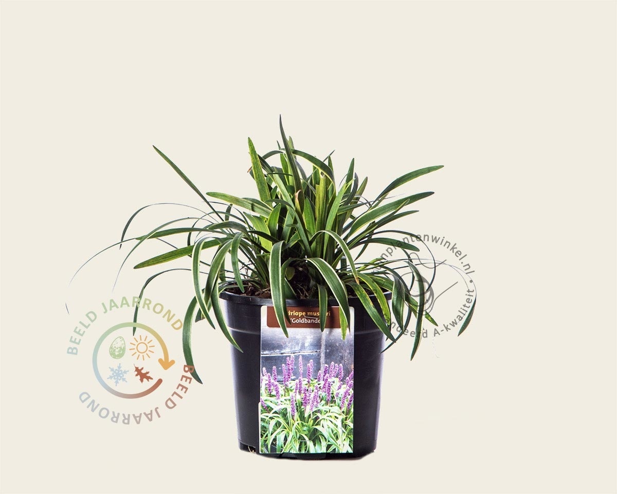Hét kenmerk waarmee de Liriope muscari 'Gold Banded' zich onderscheidt van de soort, is het blad wat goud/geel gekleurd is langs de rand. Waar de overige soorten Leliegras prima geschikt zijn voor het aanplanten van grote (schaduw)vakken, is het bij deze beter om het tot kleinere oppervlakken (tot ongeveer 3 m2) te beperken. De Liriope muscari 'Gold Banded' groeit wat minder snel dan zijn groenbladige broertjes. Wat niet wegneemt dat het een mooie en goede toevoeging is voor de border. Leliegras is wintergroen en geeft in de nazomer prachtig paarse bloemaartjes die sterk op de bloemen van de Blauwe druifjes lijken. Hiernaar verwijst dan ook de naam muscari. Deze tuinplant komt goed tot zijn recht aan de voorzijde van een border, maar kan ook prima in de Japanse tuin aangeplant worden. Liriope muscari 'Gold Banded' kan goed combineert worden met bijvoorbeeld Hosta's of andere nazomerbloeiers zoals de verschillende Sedumsoorten.