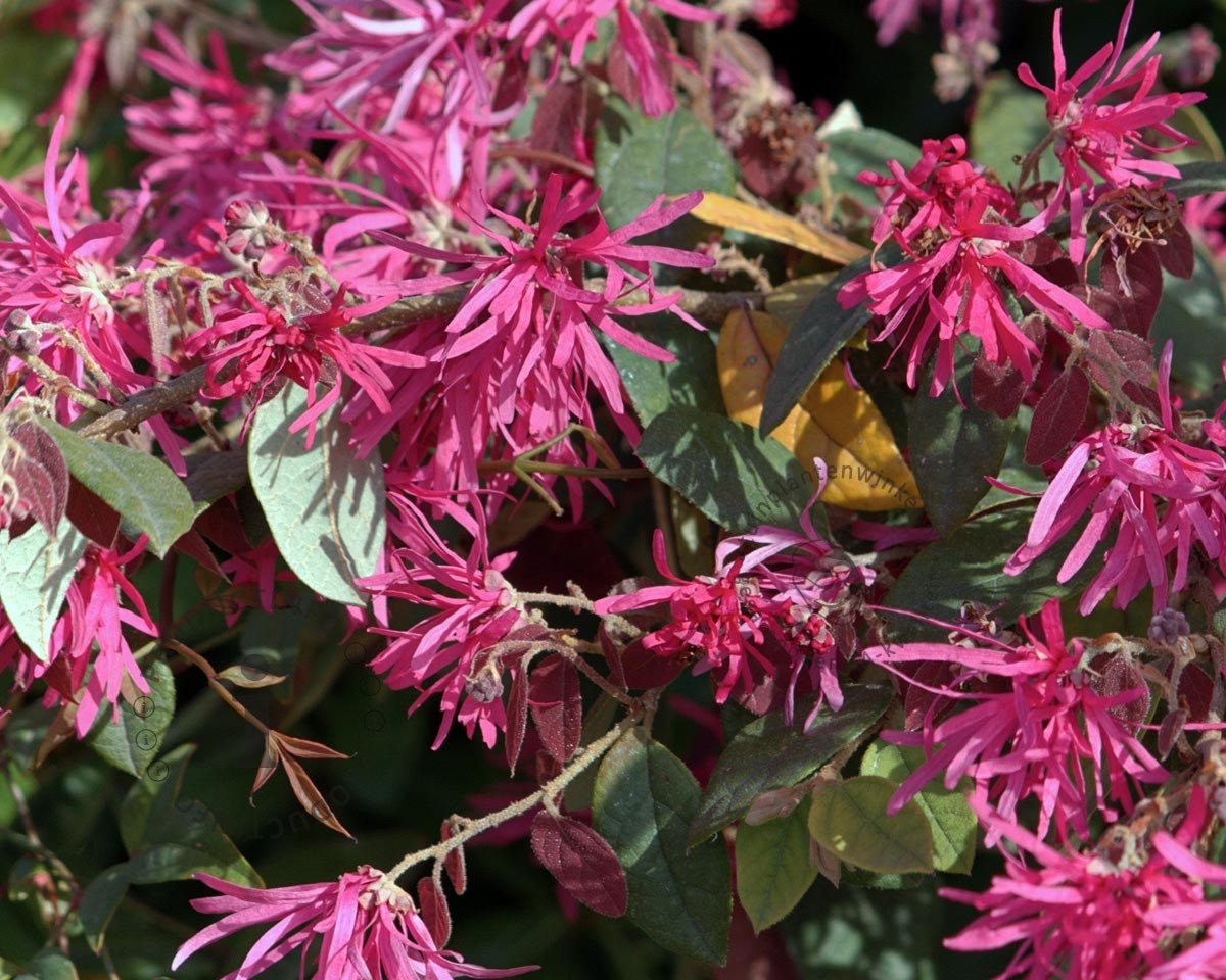 Loropetalum chinense 'Fire Dance' wordt ook wel Chinese franjeboom genoemd of Heksenstruik.
