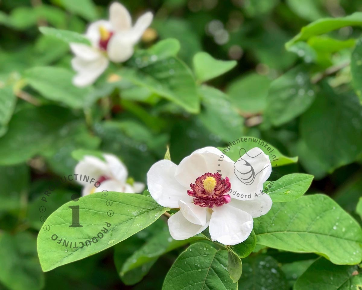 Wie de bloemen van de Magnolia sieboldii ziet, denkt hierbij niet meteen aan een Beverboom. Waar de meeste bloemen van de Magnolia een opgaande (tulpvormige) bloeiwijze hebben, is dit er een met 9 openstaande kroonbladeren. Maar hij is niet minder mooi! De kroonbladeren zijn zuiver wit van kleur, daarbinnen staan de rode meeldraden met een groen/geel gekleurde stamper. Werkelijk prachtig zoals hij eruit ziet! De bloemen verschijnen in de maand juli. Later in het jaar komen er roze vruchten aan de boom. Deze Beverboom is bladverliezend.