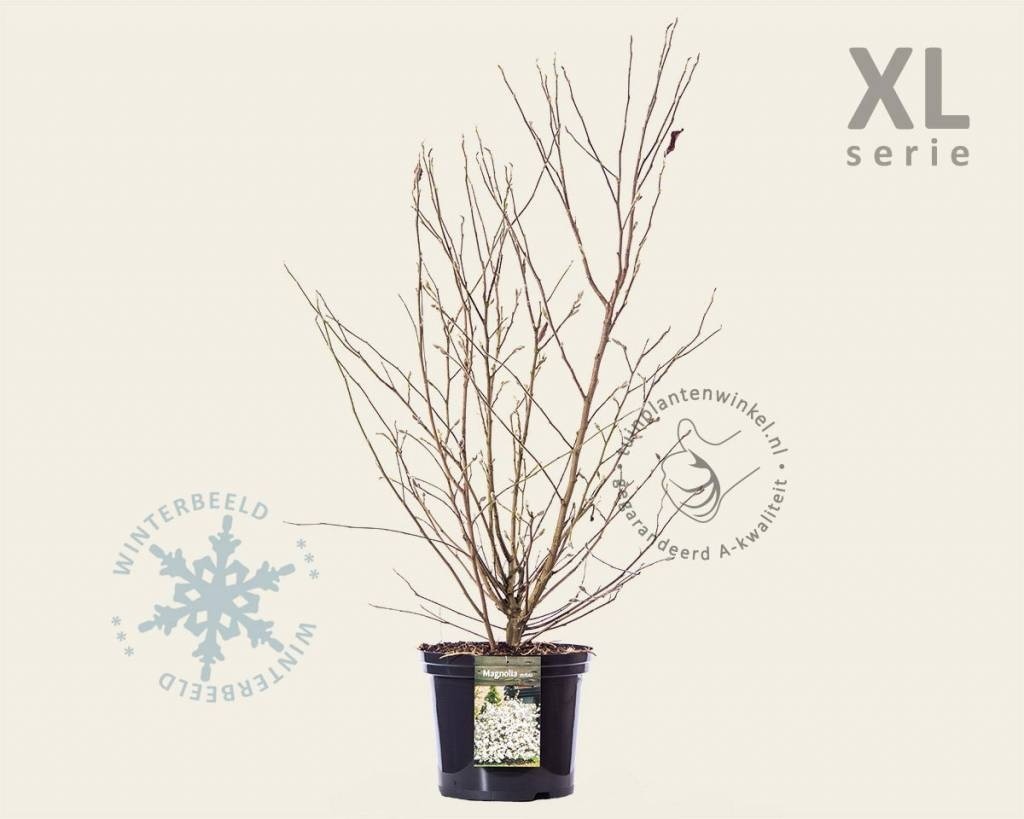 De witte, stervormige bloemen van Magnolia stellata - XL zijn een lust voor het oog en verschijnen al in maart op de kale takken. Nachtvorst in het voorjaar kan de ontluikende bloemen beschadigen. Magnolia's worden ook wel eens tulpenboom genoemd. Dit komt omdat de bloemen van een aantal soorten wel wat weg hebben van het bekende bolgewas. De Stermagnolia komt het best tot zijn recht als solitair in de grotere tuinen, waar hij door zijn langzame groei nauwelijks gesnoeid hoeft te worden. Toepassing in de kleinere tuinen kan ook, maar dan is snoei voor behoud van de compacte vorm gewenst.