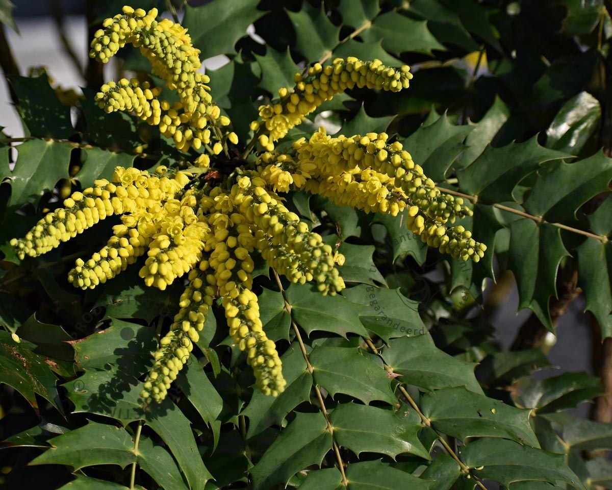 Mahonia japonica 'Hivernant' bloeit in de winter met lange bloempluimen met heldergele, geurende bloemen en zorgt zo in de donkere maanden voor wat kleur in de border. Na de bloei vormen zich donkerblauwe bessen. De Mahoniestruik heeft leerachtige, stekelige bladeren, die in de winter aan de tuinplant blijven.