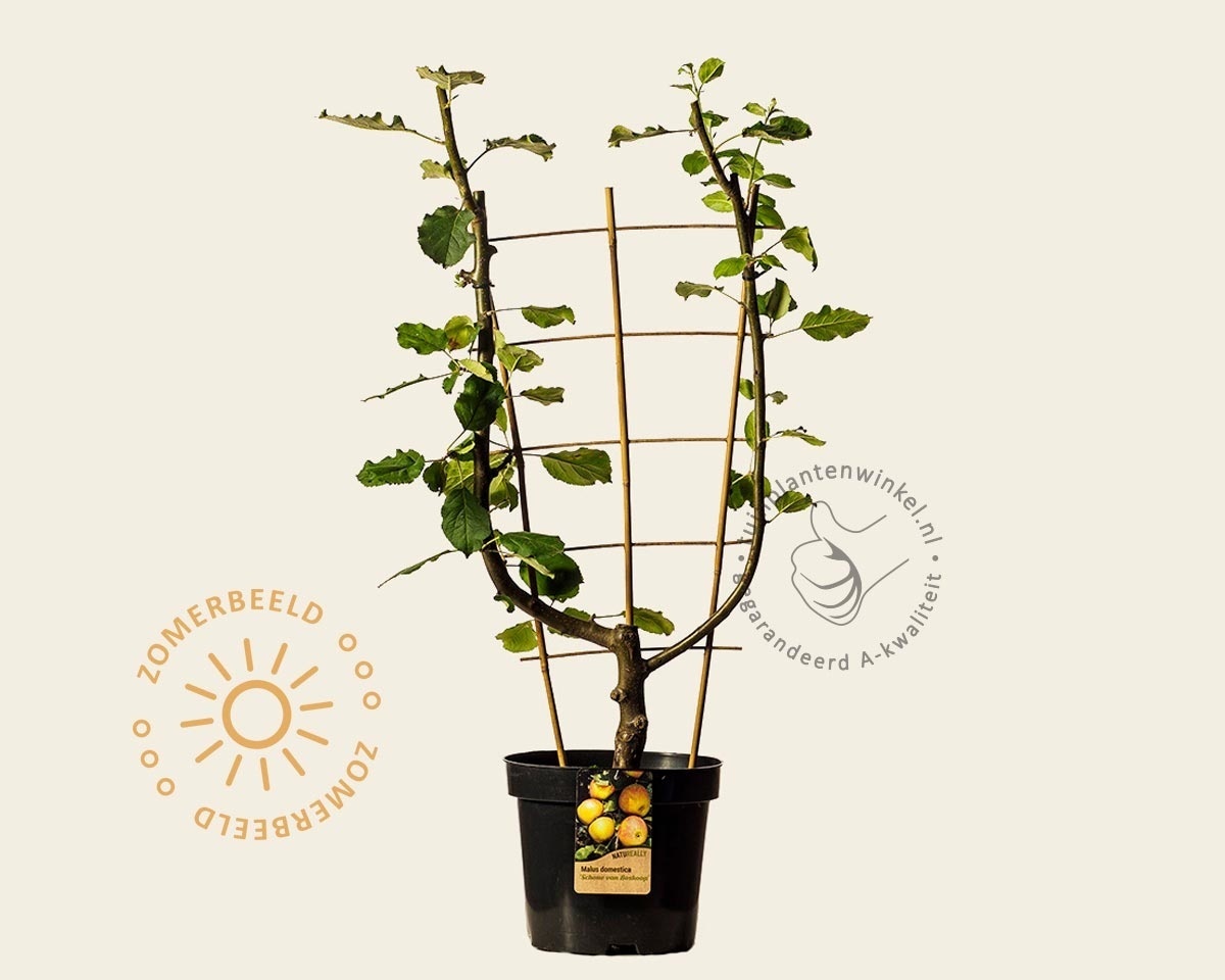 Als u weinig plaats heeft voor een appelboom, kunt u met deze u-vorm vaak toch uw eigen appels kweken in de tuin. De U-vorm kan tegen een muur of schutting worden geplaatst. Het liefst staat deze appelboom in de zon. U kunt de takken in de toekomst verder leiden over de muur of schutting m.b.v. bamboe/tonkin stokken.