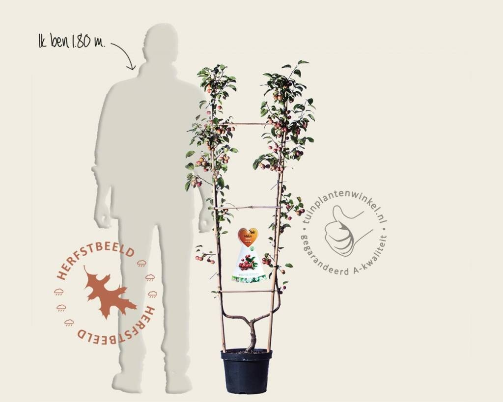 De Sierappel is een veel toegepaste tuinplant en wordt op vele manieren aangeboden. Hier in een U-vorm gekweekte vorm. Deze Malus 'Evereste' komt het beste tot zijn recht als groene onderbreking tegen een muur of schutting. In het voorjaar trakteert de Malus 'Evereste' u op een prachtige authentieke roze-witte bloemenzee. Later in het jaar, als de bloemen bevrucht zijn, komen er kleine sierappels aan deze boom. Naarmate het jaar vordert, kleuren deze sierappeltjes steeds donkerder oranje. Deze sierappels blijven tot diep in de winter aan de Malus 'Evereste' hangen.