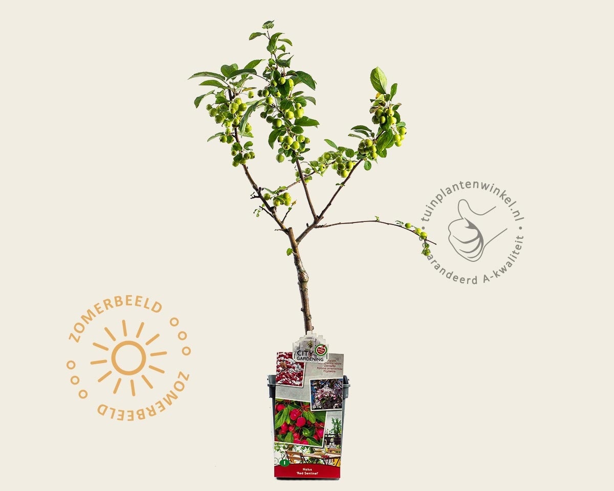 Deze mini variant van de Sierappel (ook wel patio sierappel genoemd) is geënt op een traaggroeiende onderstam. Hierdoor groeit dit boompje langzaam en blijft het compact. Dus Malus 'Red Sentinel' - mini is geschikt voor de kleinere ruimtes. Deze tuinplant heeft door het jaar heen veel te bieden. De boom luidt het voorjaar in met een uitbundige bloei. Daarna krijgt Sierappel 'Red Sentinel' vele kleine, roodkleurige appeltjes. Deze appeltjes blijven tot ver in de winter aan de boom hangen en kunnen, dankzij hun lange houdbaarheid, prima gebruikt worden om te decoreren in huis. De vruchten van deze sierappel zijn niet giftig.