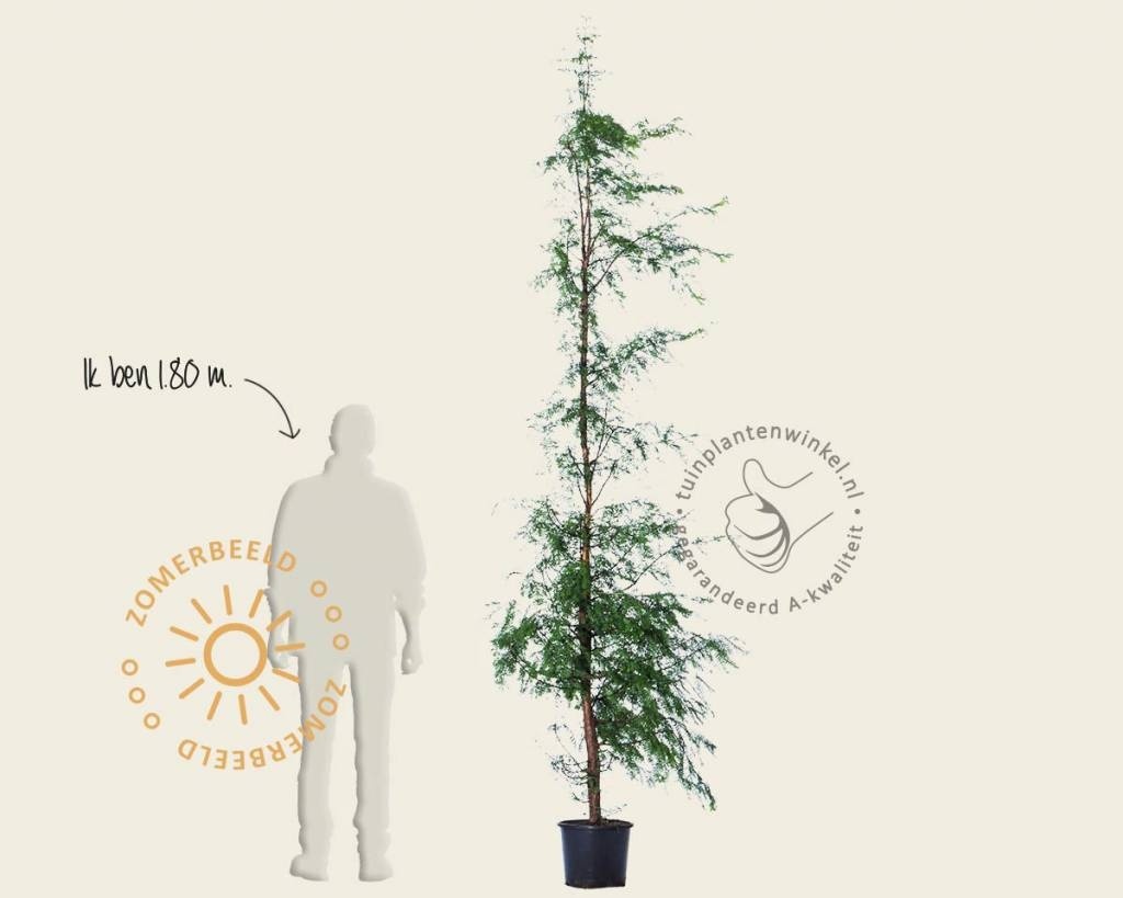 In de vrije natuur kan de Metasequoia glyptostroboides uitgroeien tot een reus van wel 40 meter hoog. Dit haalt hij in de bewoonde wereld niet, maar natuurlijk is hij "minder geschikt" voor een tuintje van een rijtjeshuis. Houd daar rekening mee als u de Watercipres zou willen toepassen. De boom krijgt een zeer karakteristieke, roodbruine, gedraaide stam. Nadat in de herfst de naalden geel verkleurd zijn, vallen ze af. Beveerd wil zeggen dat er al meteen onder aan de stam takken staan.