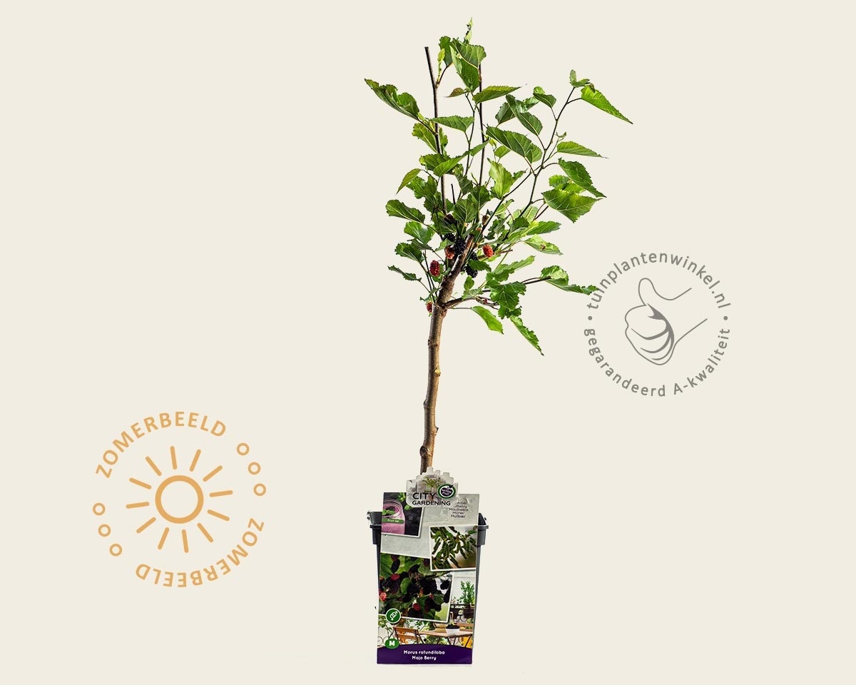 Morus rotundiloba 'Matsunaga' is een dwergvorm onder de moerbeien. Ook op een plek waar geen ruimte is voor een grote plant of boomvorm kan deze dus worden aangeplant. De Moerbei geeft vruchten op oud én op jong hout. Vandaar dat de eerste vruchten al in de eerste jaren na aanplant geoogst kunnen worden en uitermate geschikt zijn voor het maken van jam of compote. Een ander bijkomend voordeel hiervan is, dat de vruchten gedurende een maandenlange periode rijp worden. (de meeste Moerbei-soorten geven hun rijpe vruchten binnen een aantal weken).