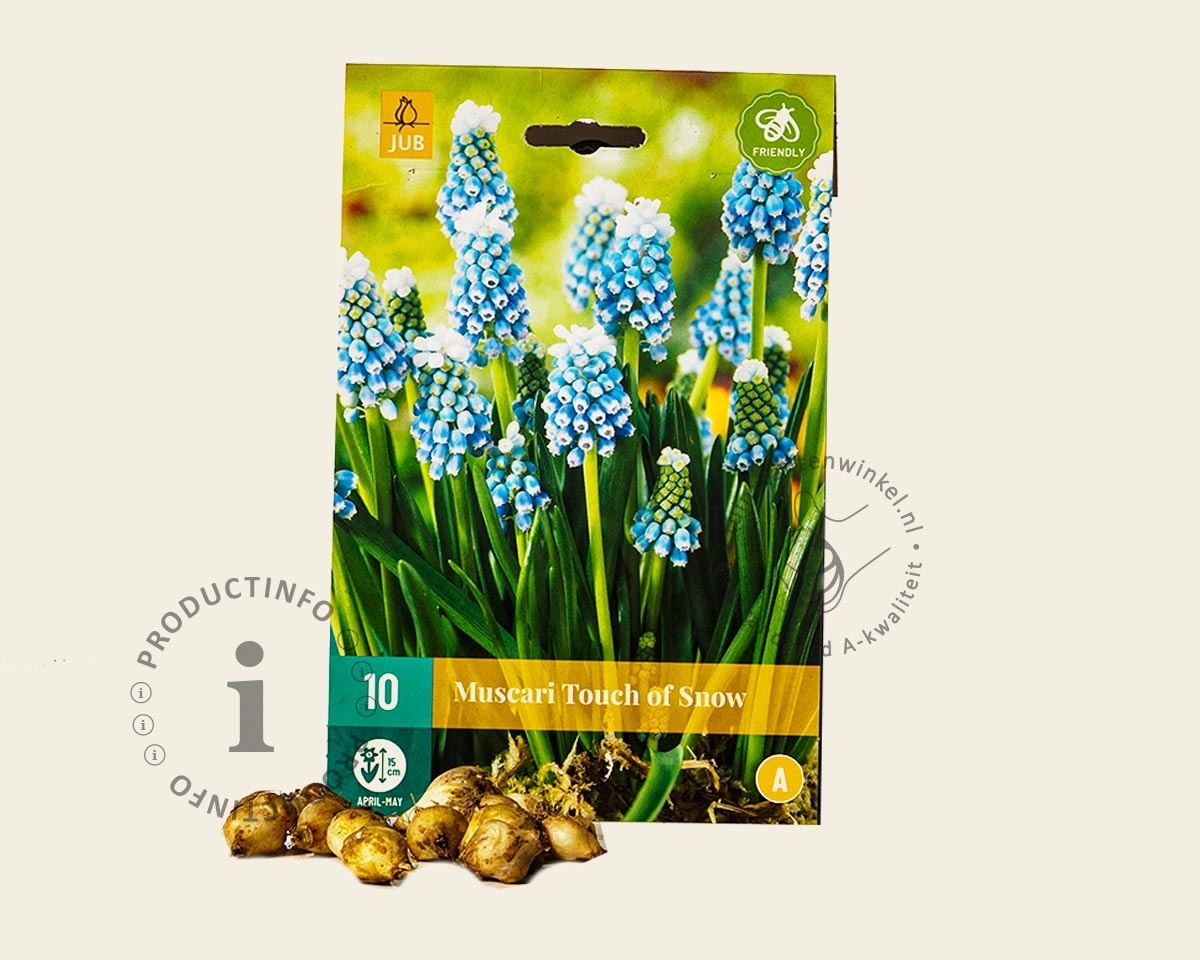 Dit Blauwe druifje behoort tot de armeniacum groep, de volledige naam van deze bloembol is daarom Muscari 'armeniacum' Touch of Snow'. Waar Blauwe druifjes normaal gesproken blauw van kleur zijn, heeft deze variant een witte bloemtop. Getoucheerd door de sneeuw zou je kunnen zeggen! Door zijn dubbele bloemkleur krijg je door enkel deze soort aan te planten al een mooi kleureneffect.