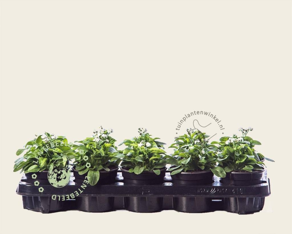 Dit vergeet-mij-nietje bloeit met witte in plaats van blauwe bloemen. Deze één- of tweejarige plant bieden we aan in het voorjaar als de eerste bloemen verschijnen. De bloei duurt van maart tot in mei. Het vergeet-mij-nietje kan in een pot of in de tuin geplaatst worden. Na de bloei sterft de plant af maar produceert ze ook zaden. Als u de planten in de volle grond plaatst bestaat er een kans dat de zaden kiemen in de zomer tot nieuwe planten welke in het opvolgende jaar tot bloei zullen komen. De plant kan dus worden gebruikt voor vermeerdering. De kans is echter groot dat u uit de zaden ook de vertrouwde blauw-bloemige planten krijgt.