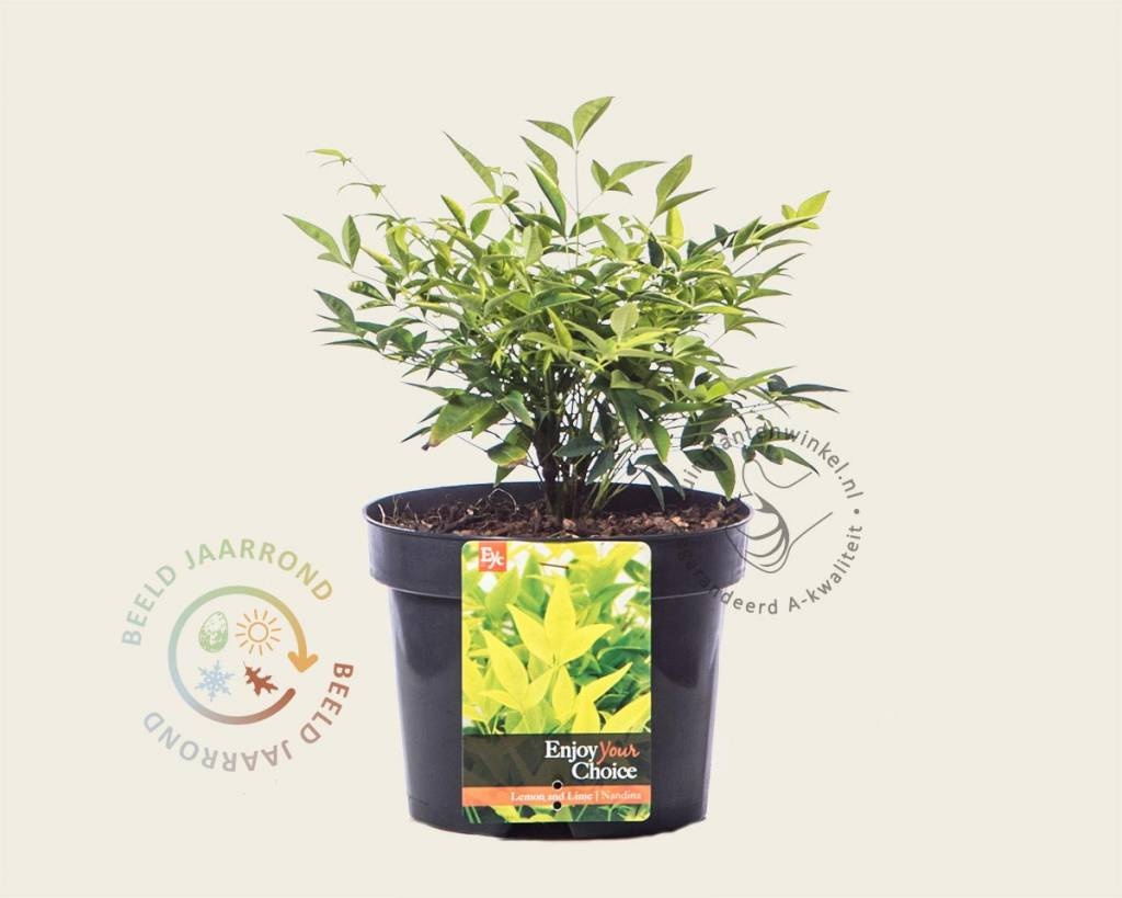 Nandina domestica 'Lemon Lime' is ondanks de naam Hemelse bamboe geen bamboesoort, maar de tuinplant heeft er wat betreft het uiterlijk wel wat van weg. Laat u dus niet afschrikken door de Nederlandse naamgeving. Het is een zeer compact groeiende heester, die bovendien groen blijft in de winter. Jonge bladeren van Schijnbamboe zijn eerst helder geelgroen. Bladeren die in de volle zon staan houden deze heldere kleur; bladeren in de halfschaduw of dieper in de plant verkleuren naar donkergroen. Nandina domestica 'Lemon Lime' maakt vanuit de bodem nieuwe spruiten aan, maar woekert niet. Schijnbamboe blijft een ronde, compacte tuinplant en is uitermate geschikt als solitair, in de border of als kuipplant speciaal in oosterse tuinen.