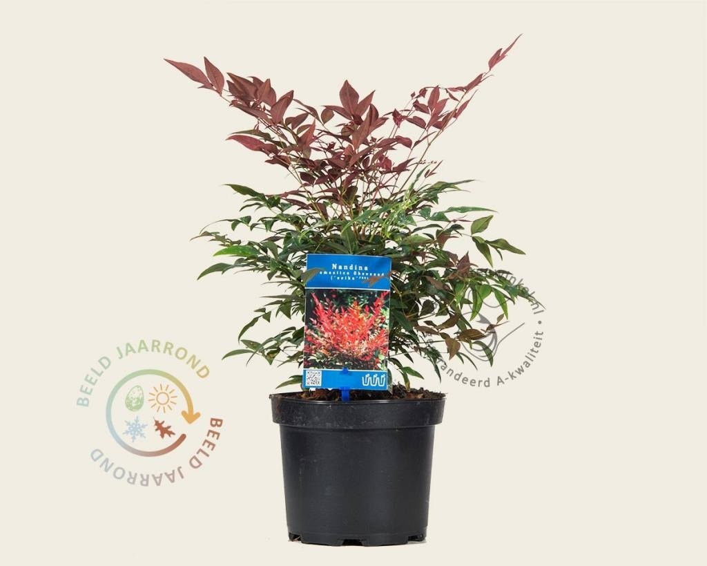Schijnbamboe of Hemelse bamboe zijn de Nederlandse benamingen voor deze heester. Deze tuinplant is niet eens nauw verwant aan bamboe, maar wat betreft uiterlijk heeft ze er wel wat van weg. Het blad van Nandina domestica 'Obsessed' loopt in het voorjaar lichtrood uit, daarna worden de bladeren groen in de zomer. In de herfst en winter kleurt het blad weer rood. Omdat deze plant wintergroen is, kunt u de gehele winter genieten van de bladkleuren. In het voorjaar vormt zich weer nieuw blad.