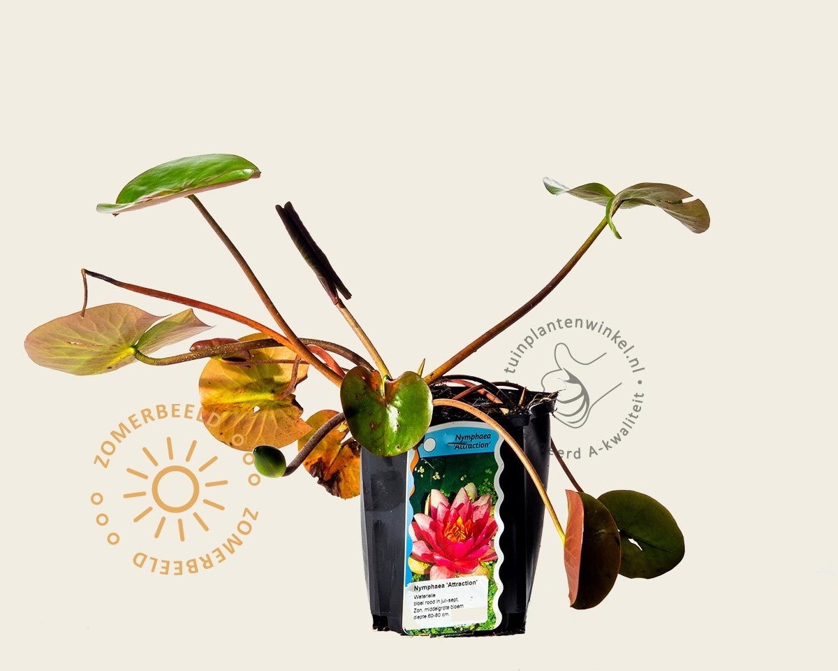 De bloemen van Nymphaea ‘Attraction’ liggen direct op het wateroppervlak en trekken in de zomermaanden de aandacht in uw vijver. De bloembladeren hebben een kleurverloop van donkerroze naar lichtroze en zijn licht geurend. Deze Waterlelie zorgt voor extra zuurstof en schaduwrijke plekken die zeker door insecten en vissen worden gewaardeerd. Nymphea ‘Attraction’ woekert niet.