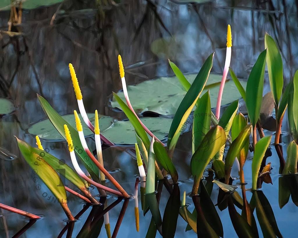 De bloemen van Orontium aquaticum zijn heel apart. Het is een witte stengel met een soort geelwit knotsje, dat verschijnt van eind mei tot augustus. De grote, donker groene bladeren kunnen op het water drijven. Kikkers, visjes en hagedissen kruipen er graag onder om zich te beschermen.