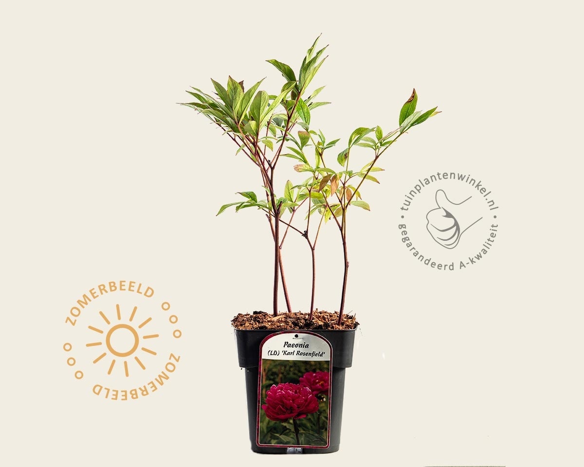 Pioenrozen zijn mooie planten met fraaie bloemen, vroeger al bekend maar ook nu nog populair. De Pioenroos is dan ook een klassieke tuinplant die in boerentuinen en in de romantische tuin eigenlijk niet mag ontbreken. Ze moeten lang op hun plaats (blijven) staan, voordat ze veel bloemen geven, geduld wordt dan ook zeker beloond. De bloem is ook geschikt als snijbloem. Paeonia lactiflora 'Karl Rosenfield' bloeit in juni en juli met karmozijnrode bloemen. Naarmate de bloem verder opent worden de gele meeldraden zichtbaar. Deze Pioenroos wordt ongeveer 90 cm hoog.