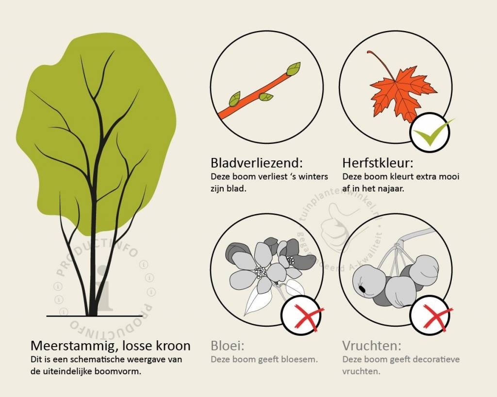 Het blad van deze plant verkleurt in het najaar. De kleuren op de foto geven een indicatie van deze verkleuring. De exacte verkleuring is afhankelijk van de standplaats en het weer en kan per jaar verschillen. Het is dus niet zeker of u de verkleuring zoals deze gefotografeerd is, ook terugziet in uw tuin. Aan de kleuren die op deze foto zichtbaar zijn, kunnen geen rechten worden ontleent.