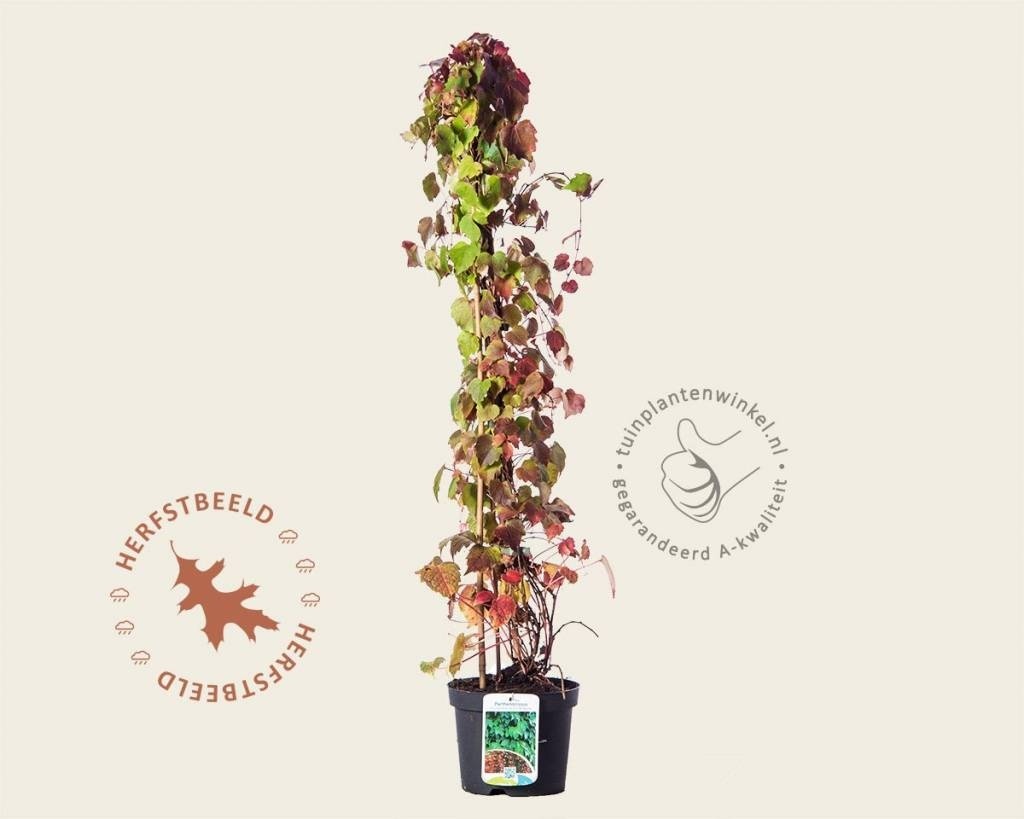 De Wilde wingerd is een prachtige zelfhechtende klimplant; hoeft dus niet opgebonden te worden. Ideale tuinplant om bijvoorbeeld een lelijke muur te camoufleren. In een paar jaar zorgt de Wilde wingerd of Kasteel wingerd dat een muur van 10 m hoog bedekt is! Het driepuntige blad van de Parthenocissus tricuspidata 'Veitch Boskoop' heeft een prachtige felrode herfstverkleuring; het is een bladverliezende tuinplant. De groengele bloemen vallen in het voorjaar nauwelijks op. Deze Wilde wingerd kan zowel in de zon als in de schaduw staan.