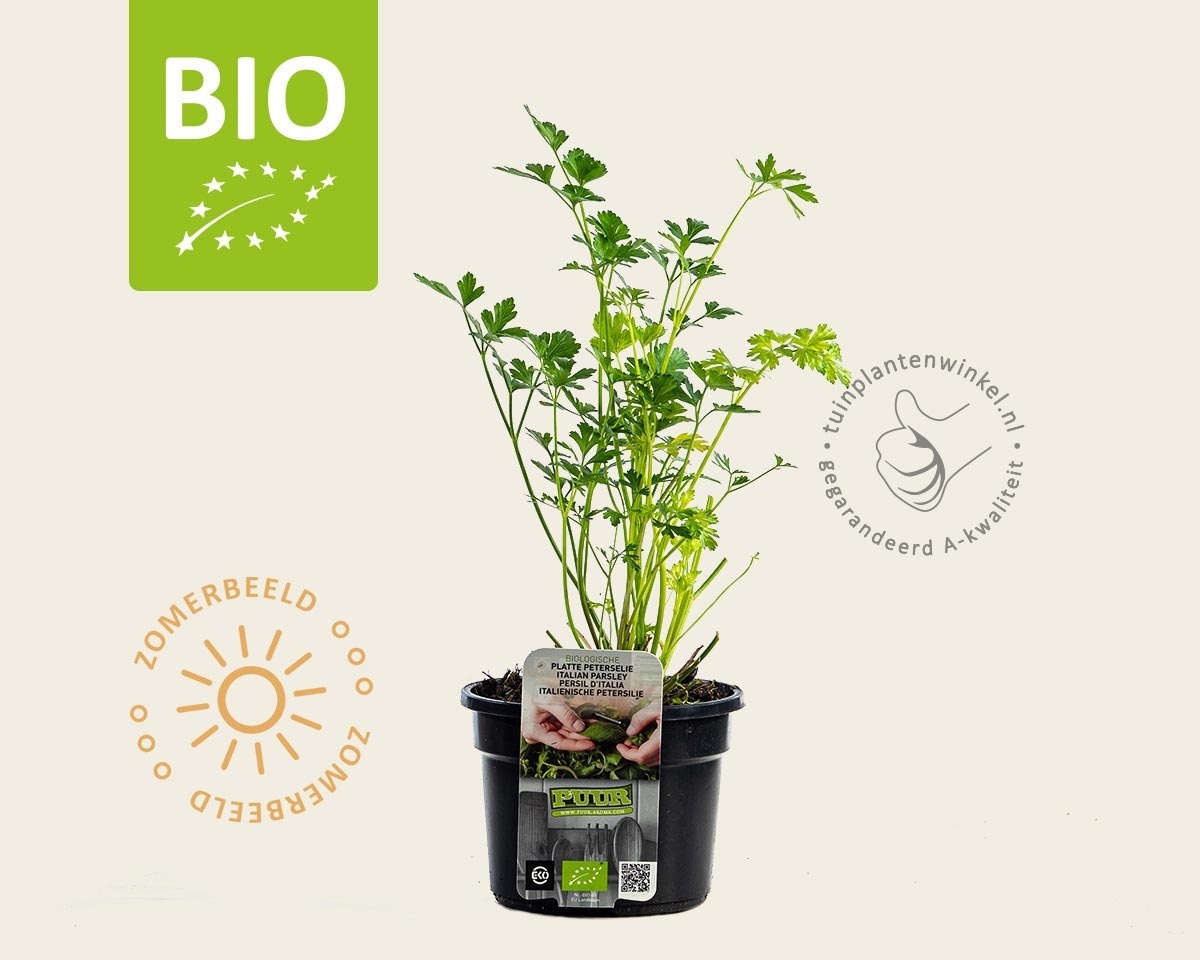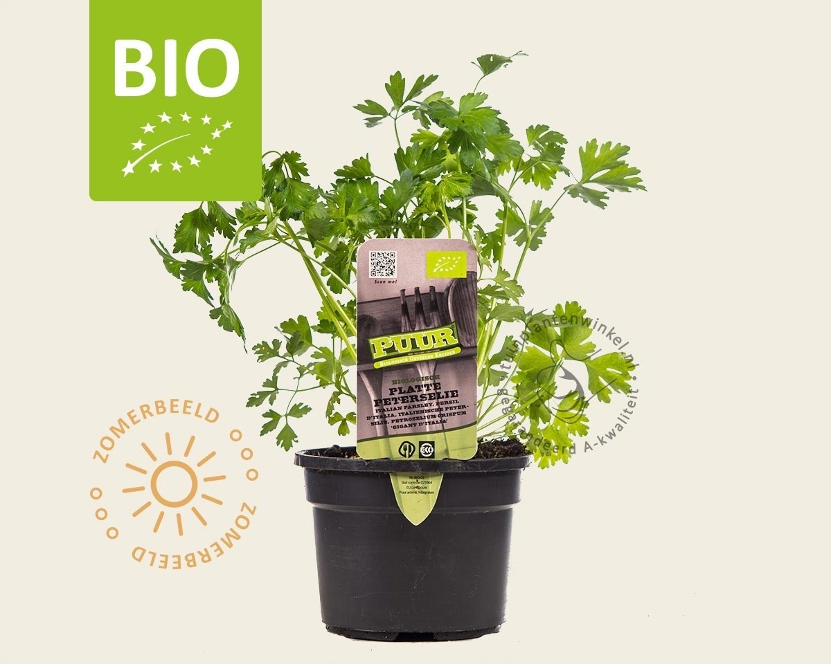 Petroselinum crispum 'Gigant d'Italia' Puur is een bladverliezende kruidenplant. Deze platte peterselie wordt uiteindelijk ongeveer 25 cm hoog en staat bij voorkeur in de zon - halfschaduw.