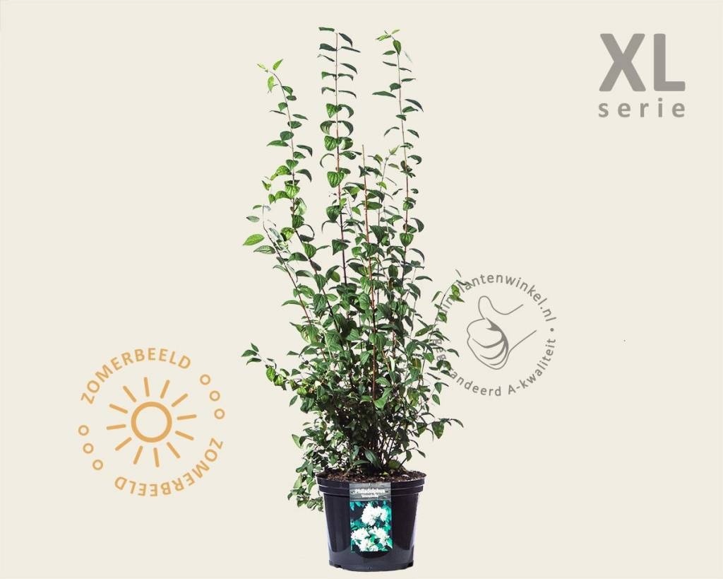 Philadelphus 'Snowbelle' - XL kan als solitaire tuinplant of als haag aangeplant worden. De Boerenjasmijn heeft met zijn breed gespreide groeiwijze ruimte nodig; wordt ongeveer 1,5 m hoog en groeit breed uit. De sierheester is goed winterhard, maar bladverliezend. In mei bloeit de struik uitbundig met heerlijk ruikende witte bloemen, die licht overhangend zijn wat een speels effect sorteert en die mooi afsteken tegen het fris groen van de bladeren.