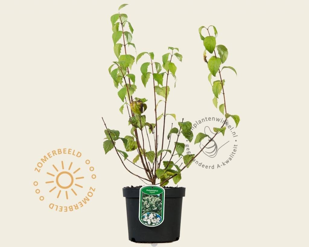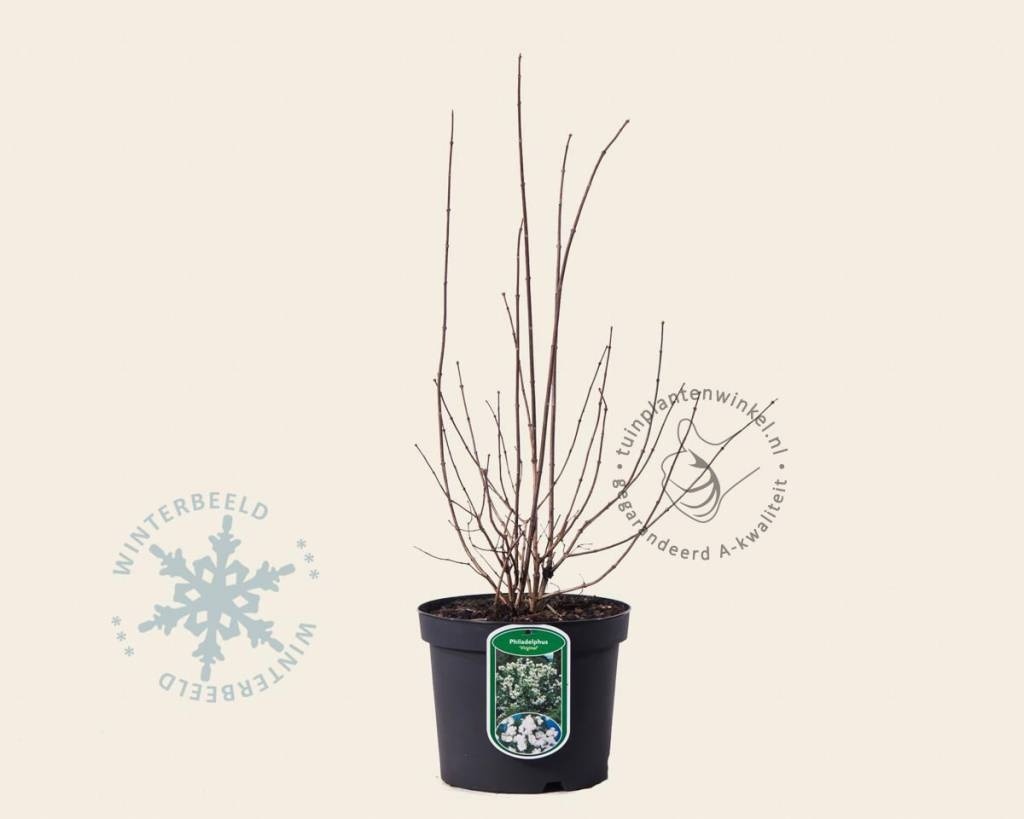 Philadelphus 'Virginal' bloeit in mei/juni met grote, trosvormige, witte, geurende bloemen, die bijen en vlinders aantrekken en oorspronkelijk uit Noord-Amerika en Azië komt. Philadelphus 'Virginal' voldoet op iedere plaats in uw tuin en wordt zelfs als haag aangeplant. Een 5-tal cm dieper aanplanten bevordert de groei van nieuwe scheuten vanuit de basis. Deze tuinplant is goed winterhard, maar bladverliezend.