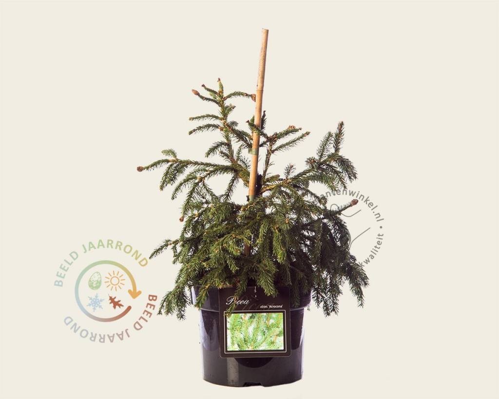 Picea abies 'Acrocona' is een decoratieve, grillig groeiende tuinplant. De Fijnspar heeft een brede basis en groeit op in een piramidevorm. Soms richt een enkele tak zich op en groeit de spar een stukje in de hoogte om vervolgens weer af te hangen. Door zijn rood uitlopende kegels aan het einde van de neerhangende takken, heeft Picea abies 'Acrocona' extra sierwaarde en is daarom geschikt als solitair in uw tuin.