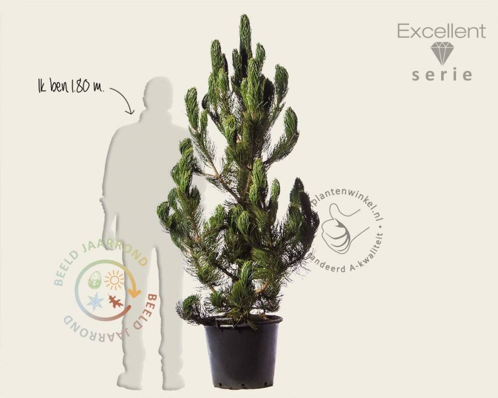 Met de Pinus heldreichii 'Satellit' uit de Excellent-serie heeft u direct een flinke den. De jonge Bosnische den wordt zeer zorgvuldig op vorm gekweekt. Wij leveren deze tuinplant in een pot met Ø 50 cm en een hoogte van rond de 150 cm. Deze variant is een decoratieve dwergvorm van de Bosnische den. Uiteindelijk kan deze tuinplant 300 cm worden. Deze tuinplant heeft een slanke, wat losse, kegelvormige groeiwijze. Geschikt voor de kleinere tuin of in een sierpot op het balkon of terras. De naalden hebben een heldergroene kleur en staan naar binnen gericht en blijven het hele jaar door aan de tuinplant. De schors is bijna wit.