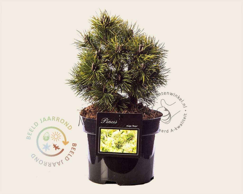 Pinus mugo 'Mops' is een kleinblijvende conifeer, die een hoogte van 80 cm bereikt. De plant heeft van nature een bolvormige groeiwijze en wordt ongeveer net zo breed als hoog. De Bergden is wintergroen, de grijsgroene naalden zorgen het hele jaar voor een groen accent in de tuin. Opvallend zijn ook de mooie dennenappels, die in het voorjaar aan de plant komen. Pinus mugo 'Mops' is als solitaire plant is geschikt voor de kleine tuin, de rotstuin en kan zelfs in een pot op het terras of balkon. Met meer Bergden- struikjes bij elkaar kan ook prima een vak met nieuwe planten groen ingevuld worden. De plant heeft een goede winterhardheid en kan tegen luchtvervuiling.