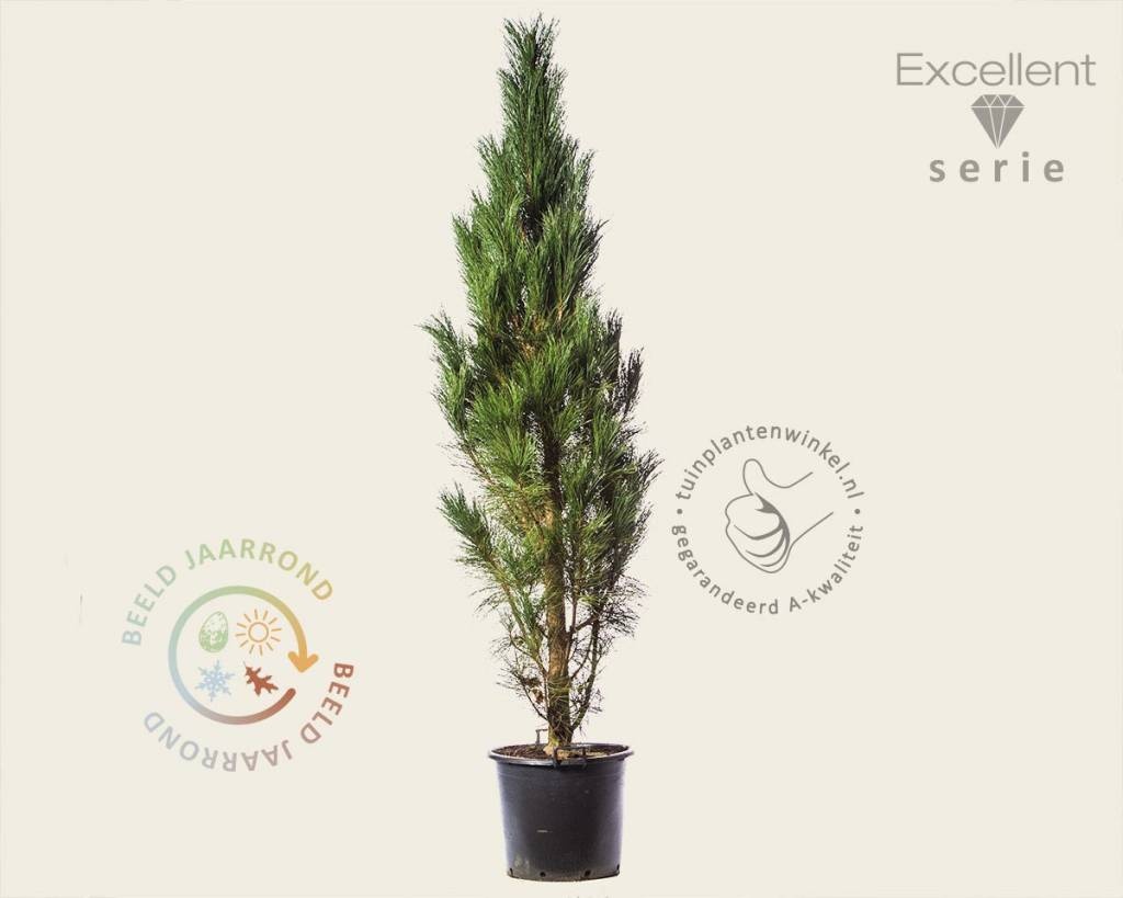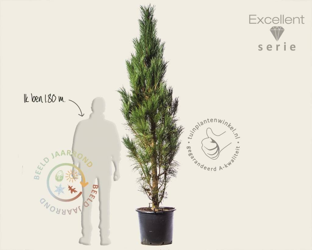 De Pinus nigra 'Molette' 200/250 - Excellent is een mooie, zuilvormige tuinplant die kan doorgroeien tot een hoogte van 3 - 5 meter. Door zijn cilindrische vorm is de Zwarte den ook geschikt voor een kleine of smalle ruimte. Daarnaast wordt de Pinus nigra 'Molette' als een groep aangeplant in parken en tuinen. Deze tuinplant heeft groene naalden, die soms wel een lengte van 20 cm bereiken.