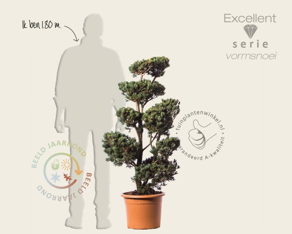 In de Excellent-serie wordt Pinus parviflora 'Ryu-ju' in een bonsai-vorm gekweekt. Dit gebeurt door zorgvuldig leiden en snoeien van de naaldboom. De gemodelleerde vorm van de tuinplant staat daardoor vast. De Japanse Witte den is groenblijvend. Opvallend aan deze variant is de compacte groeiwijze en de korte grijsgroene naalden die gedraaid aan de twijgen zitten. Als u Pinus parviflora 'Ryu-ju' een prominente plek in de zon of halfschaduw geeft, zal het een blikvanger in de tuin zijn. De tuinplant groeit het beste in goede tuingrond. Zorg voor een goede doorlaatbaarheid van de bodem bij het planten. Af en toe wat mest geven en bij droogte water.