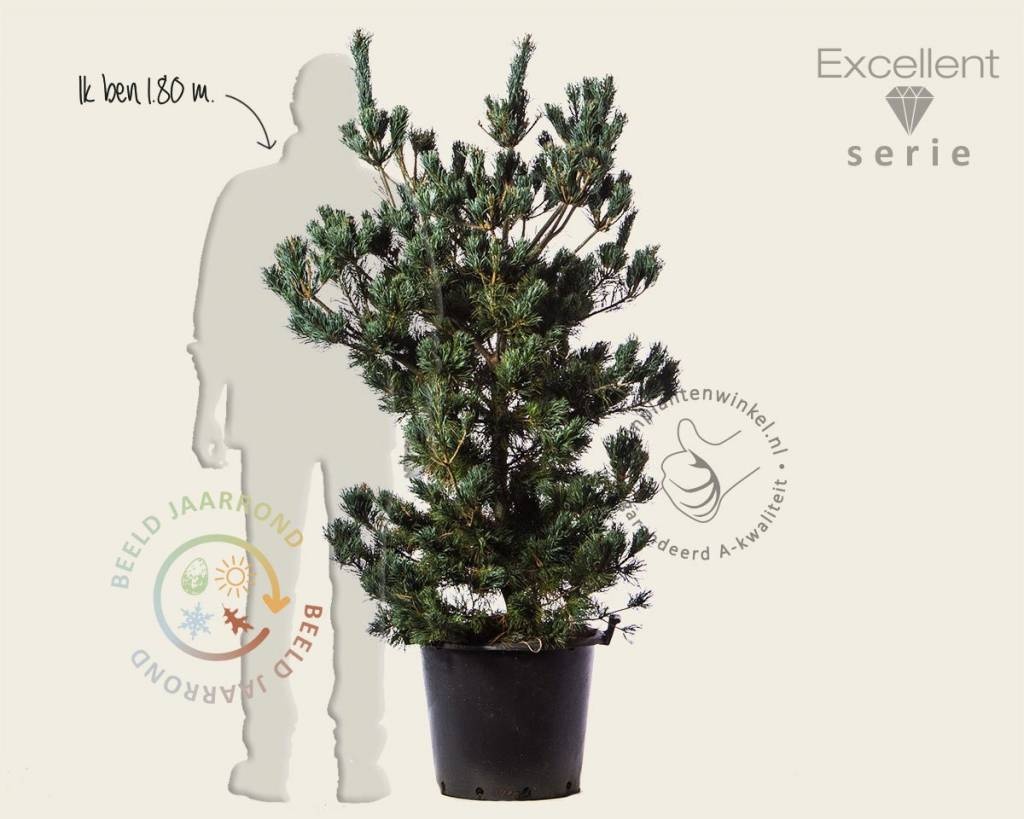 Pinus parviflora 'Tempelhof' uit de Excellent-serie is een met zorg gekweekte den, die wij in een pot met Ø 50 cm leveren. Met een hoogte van minimaal 125 cm heeft u direct al een aardige boom in de tuin. Het een zeer winterharde den. De Japanse witte den is groenblijvend. Met de fijne grijsgroene (blauwachtige) naalden, zijn paarsbruine schors en paarsrode/bruine dennenappels zorgt deze tuinplant voor een kleurrijk accent in de wintertuin. Pinus parviflora 'Tempelhof' groeit langzaam, na 10 jaar is de hoogte rond de 250 cm. Uiteindelijk kan deze volgroeide den wel 10 m worden. Geef de Japanse den daarom een ruime lichte standplaats in de zon of halfschaduw. In elke licht zure bodem, die goed doorlatend is zal deze tuinplant goed groeien.