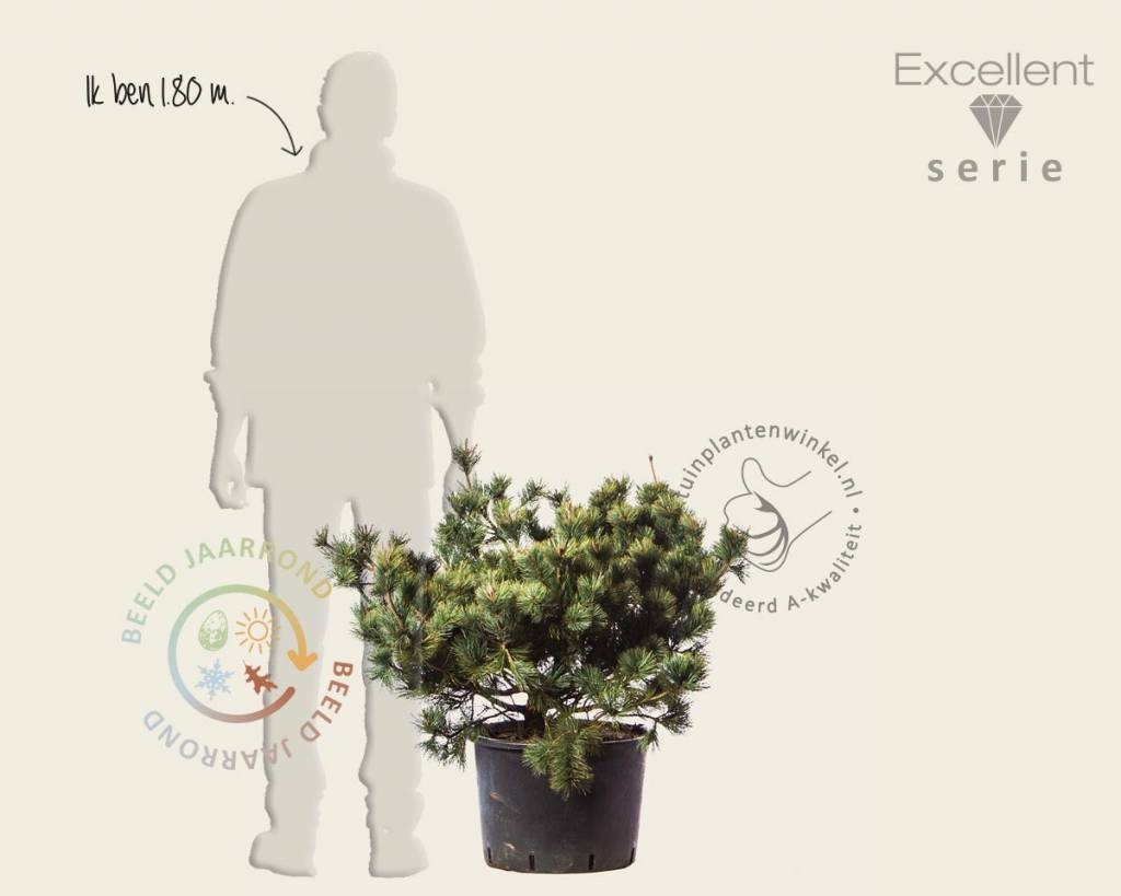 De Pinus pumila 'Dwarf Blue' 080/100 - Excellent is een Siberische dwergden met groengrijze naalden voorzien van zilverachtige strepen. Deze zeer compacte tuinplant heeft rechtopstaande takken die bijna vanaf de bodem breed uitgroeien. In de late lente komen er aan de nieuwe, lichtgroene kaarsen opzichtige rode katjes. De Pinus pumila 'Dwarf Blue' wordt vaak toegepast als extra kleuraccent in Japanse rotstuinen. De zeer winterharde Siberische dwergden geeft de voorkeur aan een standplaats in de zon of halfschaduw in een goed waterdoorlatende bodem. Snoei is alleen noodzakelijk als u de compacte vorm van de tuinplant wilt behouden; knip in de herfst of vroege winter de nieuwe kaarsen tot de helft terug.