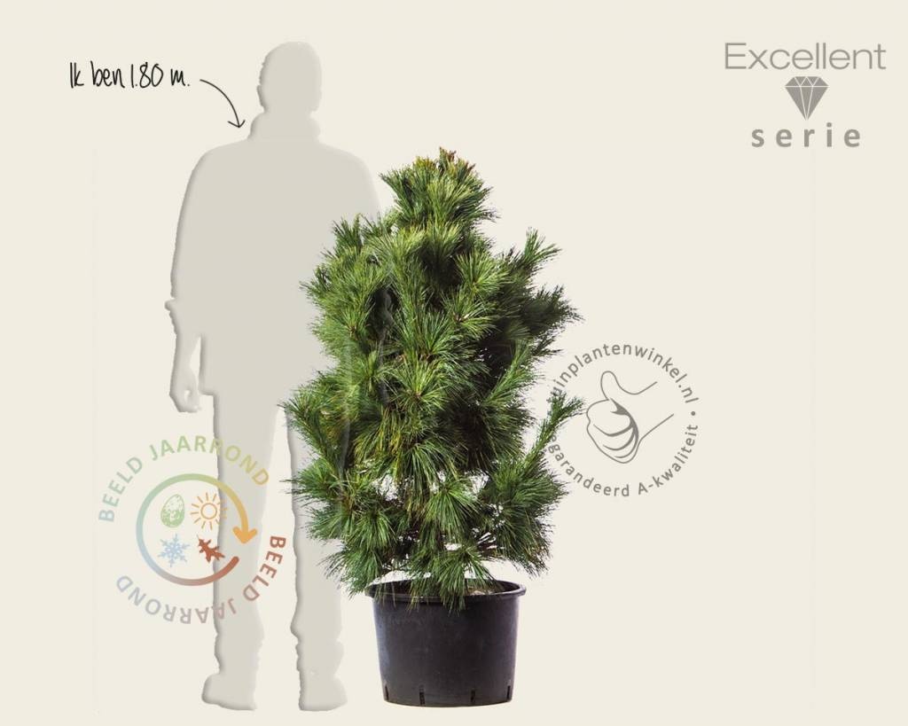 De Pinus schwerinii 'Wiethorst' 100/125 - Excellent is een compact groeiende dwergvorm van de Schwerin dennen. Deze tuinplant heeft opvallende, grijsgroene naalden met een zilverachtige onderzijde. De zachte naalden produceren al op jonge leeftijd een overvloed aan kegels. De Den is goed winterhard en wordt vaak aangeplant als solitair in Japanse rotstuinen. De Pinus schwerinii 'Wiethorst' geeft de voorkeur aan een standplaats in de zon of halfschaduw in een goed waterdoorlatende bodem. Snoei is alleen nodig als u de compacte vorm wilt behouden: knip in het najaar, als de plant is uitgegroeid, de nieuwe kaarsen tot op de helft terug.
