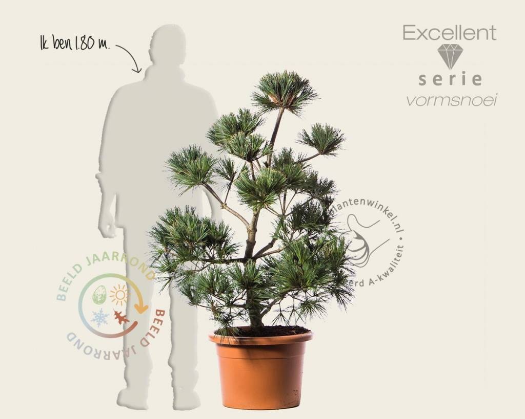 Pinus stobus 'Secret' is van huis uit een kleine naaldboom met lange grijsgroene naalden. De Weymouthden groeit van nature langzaam. In de Excellent-serie wordt deze tuinplant in een bonsai-vorm gekweekt door leiden en snoeien. De gemodelleerde vorm die de naaldboom heeft, staat daardoor vast.