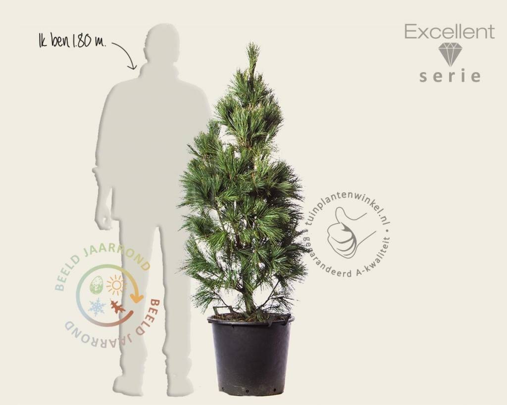 Pinus wallichiana 'Densa' uit de Excellent-serie is een een zorgvuldig op vorm gekweekt den. Het is een dwergvorm van de veel grotere Himelaya den. De Tranenden die wij leveren wordt ongeveer 3 tot 5 m hoog en is daarom als solitair geschikt voor uw tuin. Hij is slank en kegelvormig. Pinus wallichiana 'Densa' is een prachtige den, heeft een blauwgrijze uitstraling, met zijn opvallende naalden met een blauwe gloed die hangend aan de takken zitten. Aan het uiteinde van de takken vormen zich grijsgroene dennenappels (kegels) die met hars bedekt zijn. Deze den is zeer winterhard en groenblijvend.