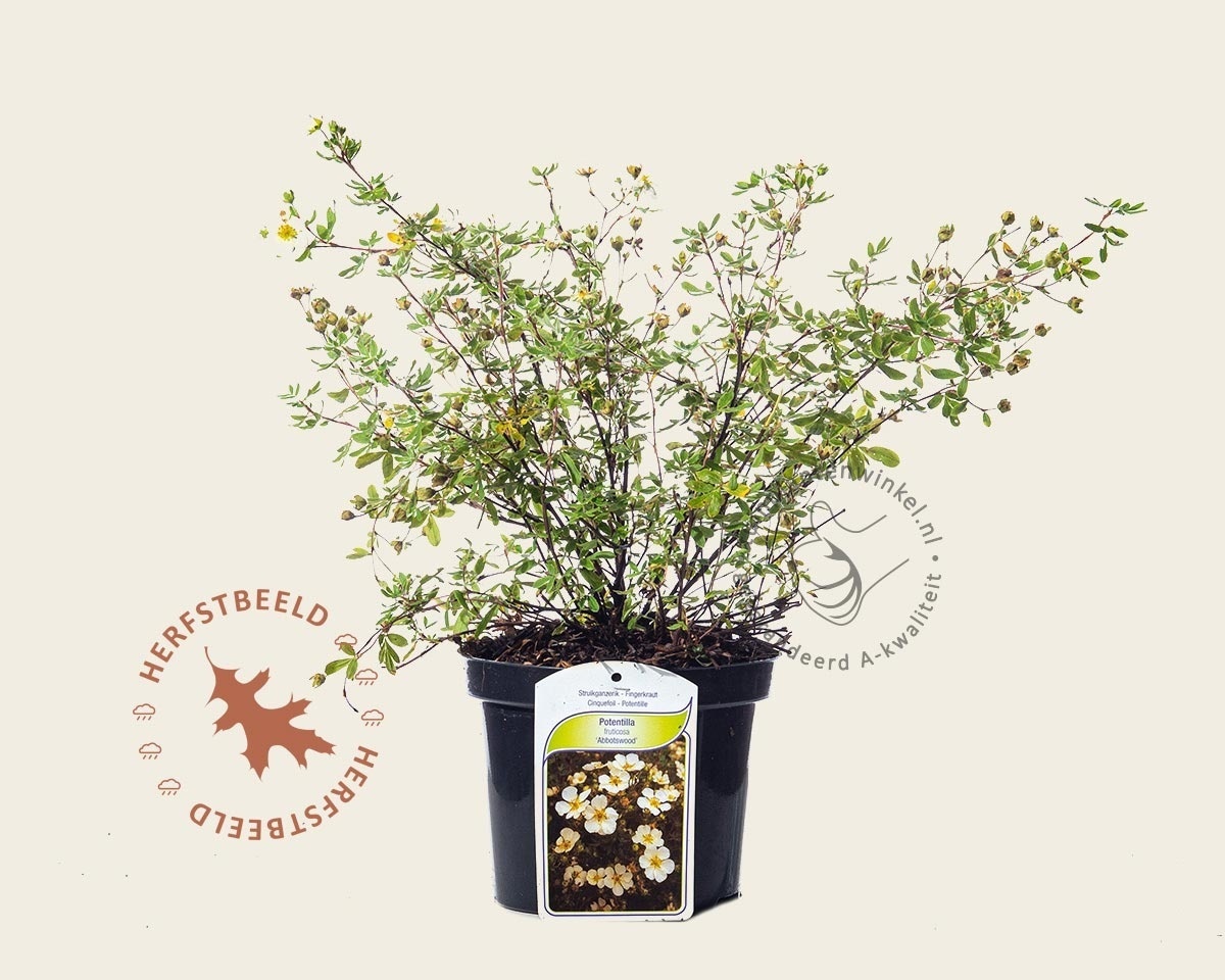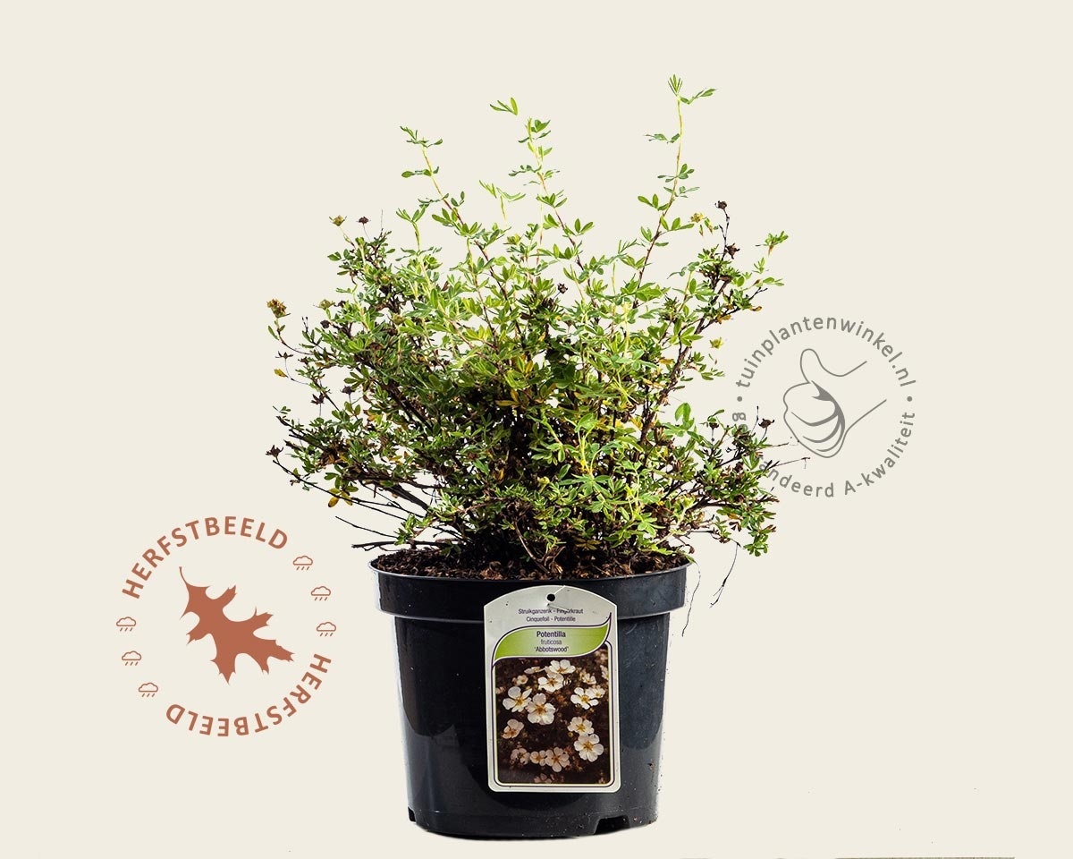 Potentilla fruticosa 'Abbotswood' is een half groenblijvende tuinplant. Deze Struikganzerik bloeit van mei t/m augustus met witte bloemen, wordt uiteindelijk ongeveer 50 cm hoog en staat bij voorkeur in de zon - halfschaduw.