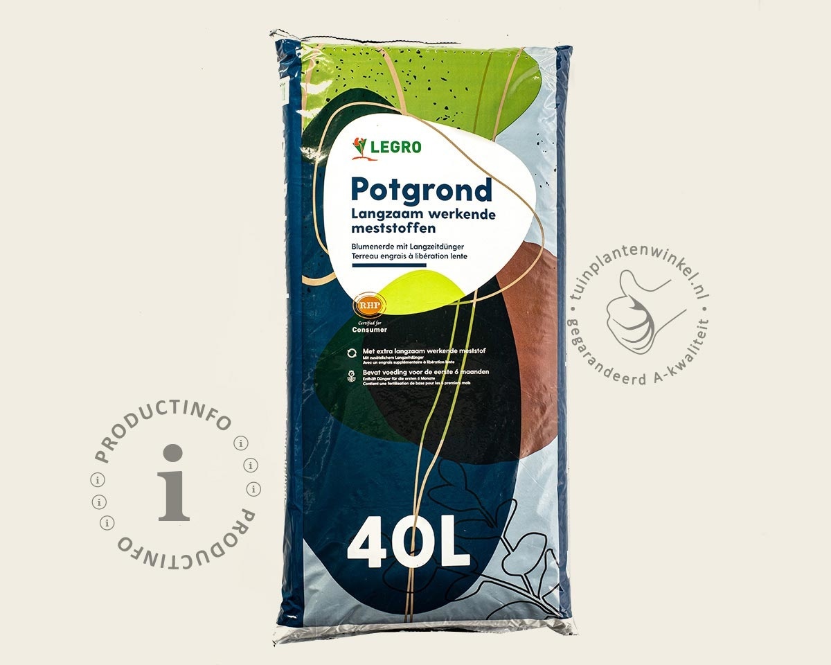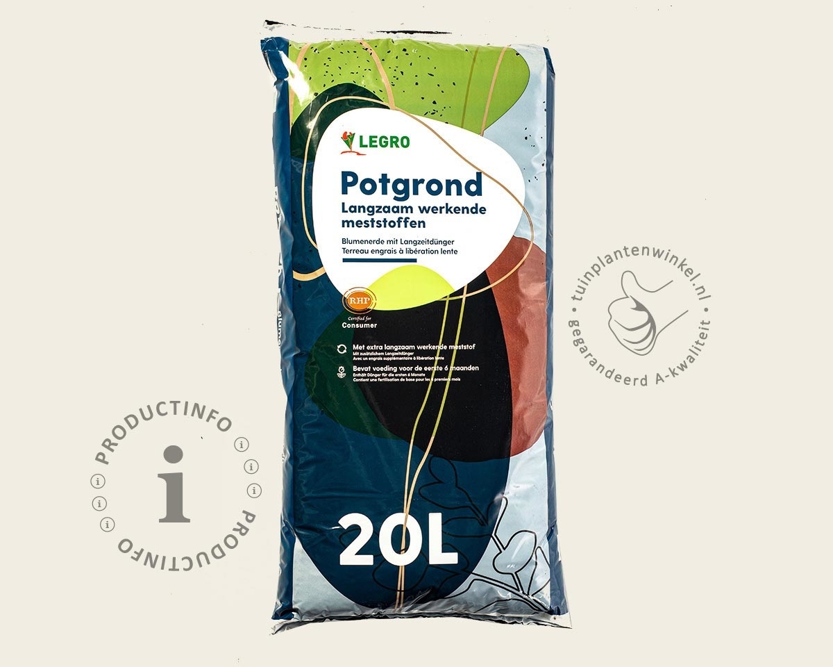 De potgrond is opgebouwd uit Tuinturf, turfstrooisel en verteerd plantmateriaal. Deze potgrond is gestoomd en daardoor onkruidvrij. Wanneer u de potgrond uit de zak haalt valt deze mooi los. Het losse en luchtige karakter vormt een ideale pakket voor plantwortels om zich te ontwikkelen.
