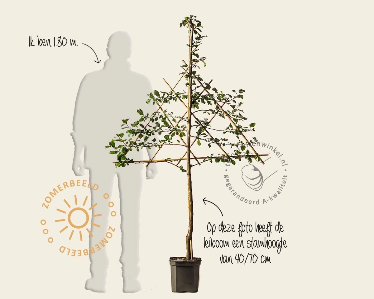 Wanneer er geen ruimte is voor een gewone fruitboom, kan een leifruitboom een goede oplossing zijn om toch te kunnen genieten van eigen gekweekt fruit! We bieden de leifruitbomen aan in diverse stamhoogtes zoals laagstam leifruit en halfstam leifruit. De stamhoogte wisselt, kijk daarom bij de productspecificaties voor de geleverde stamhoogte. Laagstam zit meestal rond de 50 cm stamhoogte, halfstam zit meestal rond de 120 cm.