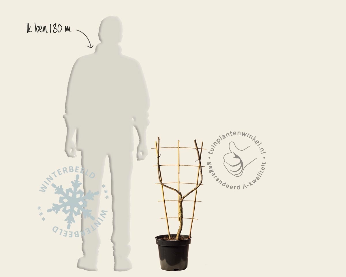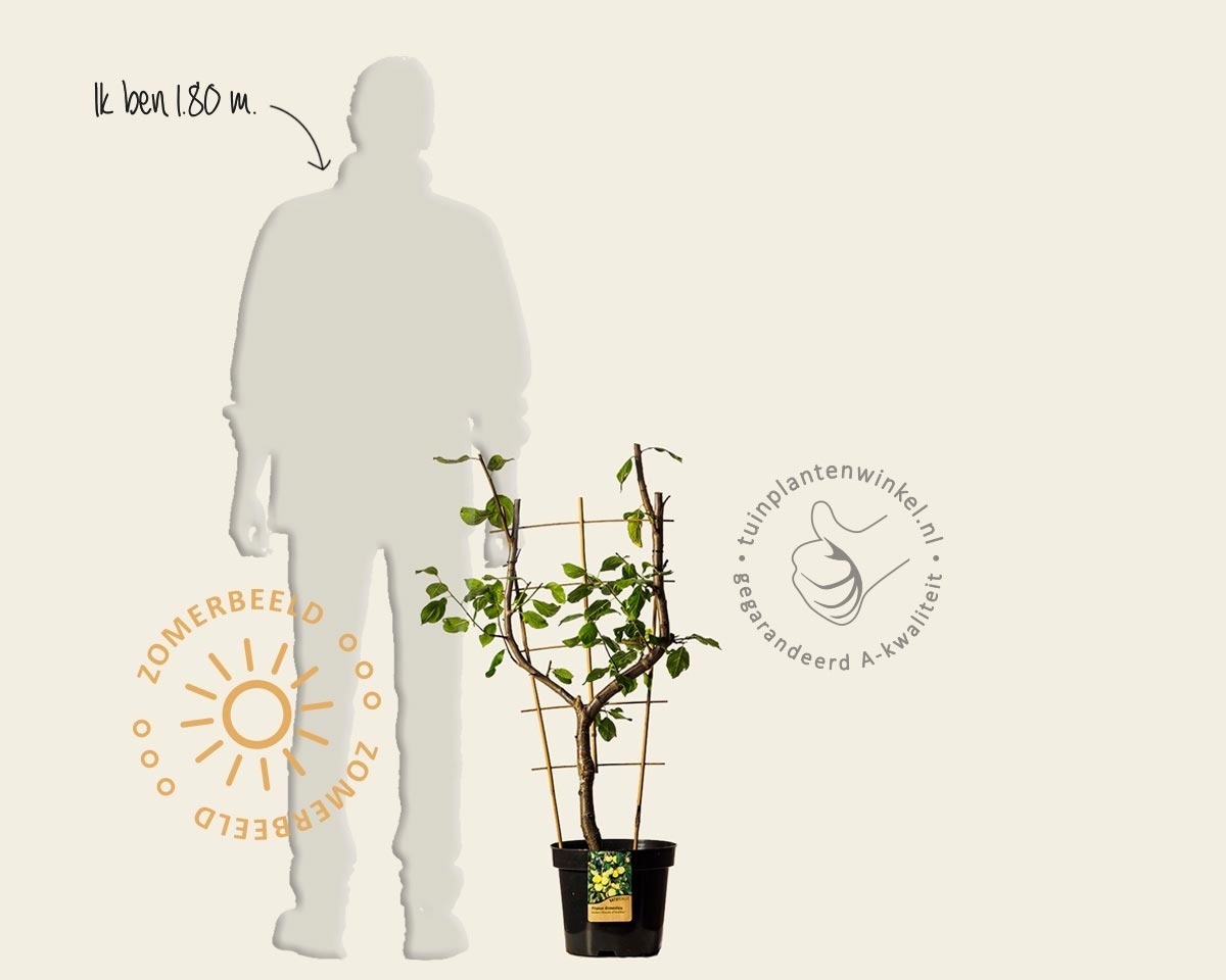 Wanneer er geen ruimte is voor een gewone fruitboom, kan een U-vorm gekweekte leifruitboom een goede oplossing zijn om toch te kunnen genieten van eigen gekweekt fruit! Prunus domestica 'Reine Claude D'Oullins' is zelfbestuivend en heeft maar weinig ruimte nodig. Pruim 'Reine Claude D'Oullins' bloeit in april met witte bloemen, waaruit een gelige, sappige pruim groeit, die vanaf augustus te oogsten is. Niet alle pruimen rijpen op dezelfde tijd, dus meerdere keren oogsten.