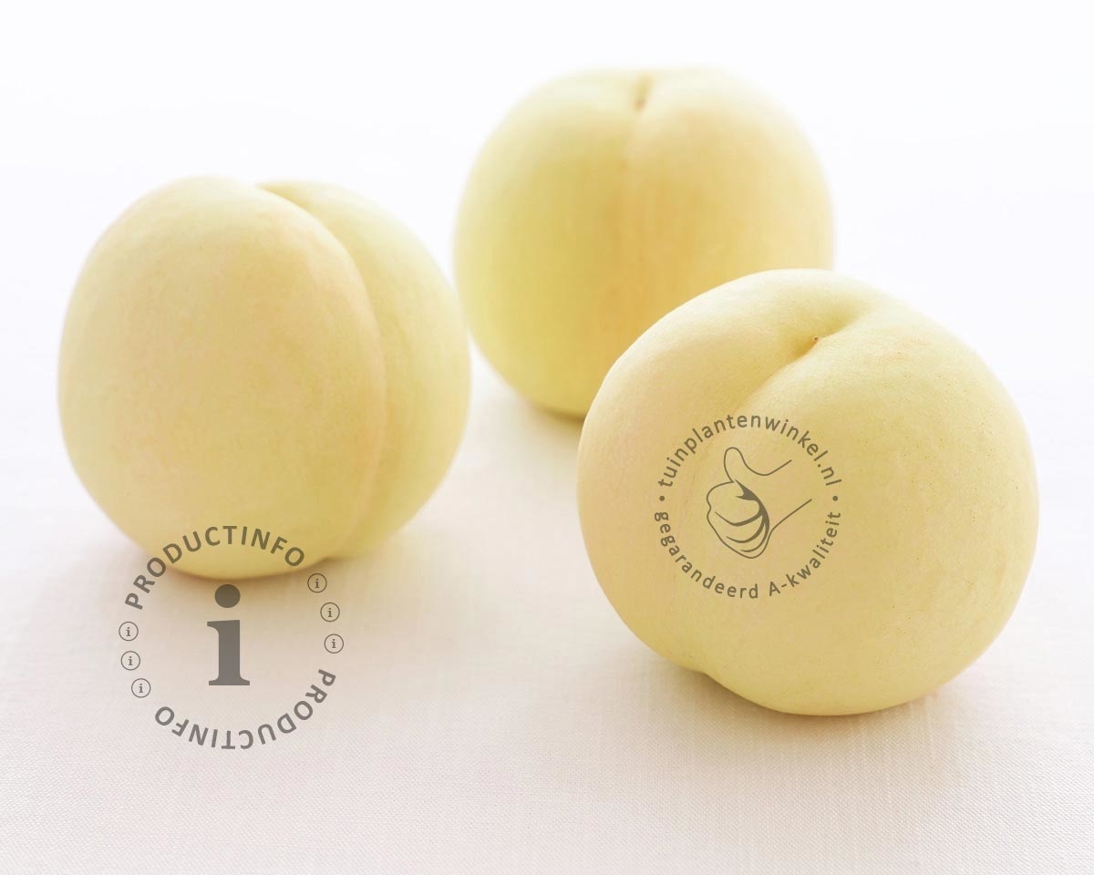 Prunus persica 'Ice Peach' geeft opvallende, lichtgeel tot wit gekleurde vruchten. Het vruchtvlees heeft een witte tot roze kleur. De bloei is roze in het voorjaar. De mini Perzik geeft in Nederland goede vruchten, die heerlijk zoet zijn. Van binnen is de perzik geel/wit en van buiten wit met soms een vleugje roze. De pit zit los in de vrucht.