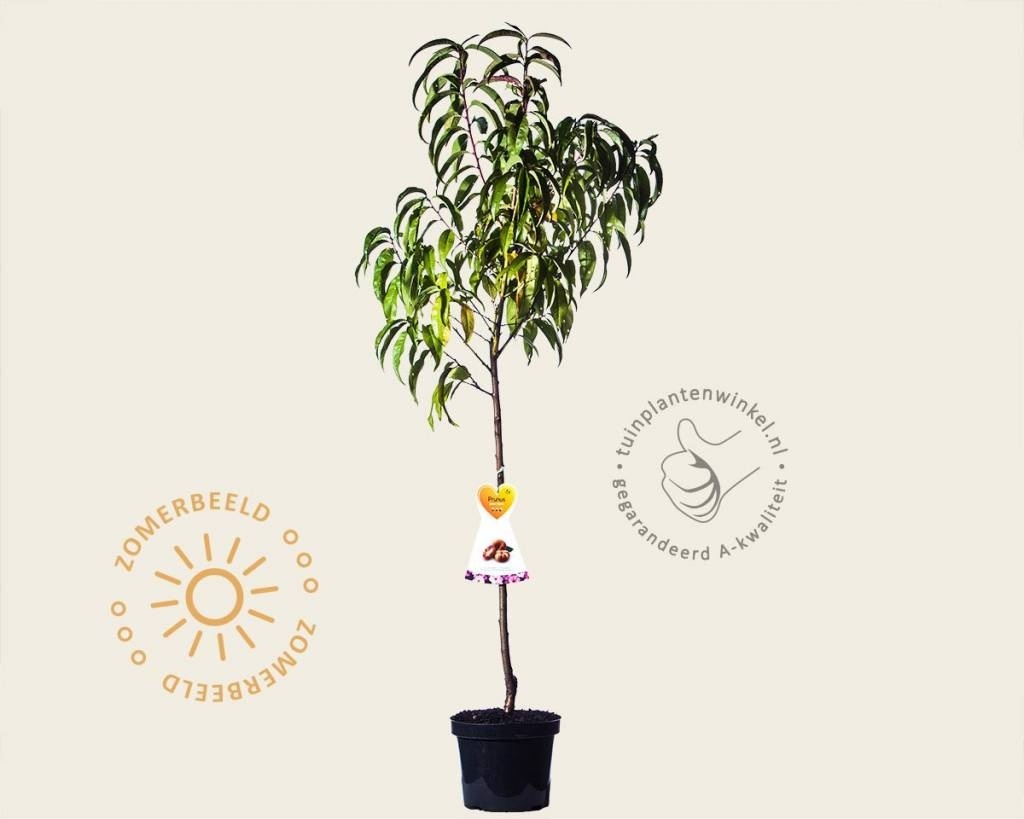 Prunus persica 'Saturn' - laagstam is een wilde perzikboom die ongeveer 2 tot 3 m hoog wordt. Bijna alle vruchten kunnen zonder ladder geplukt worden. In het vroege voorjaar komten aan deze wilde perzik boom eerst roze bloesem. Als de vorst geen roet in het eten gooit, komen later in het jaar lekkere perziken met roze vruchtvlees aan de Platte perzik. De wilde perzikboom verliest in de winter zijn bladeren en is goed vorstbestendig.