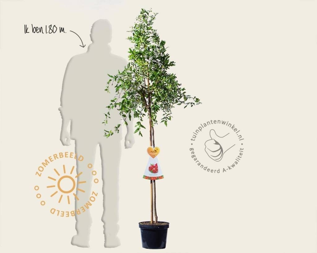 De Granaatappel is een mediterrane plant die een warme, zonnige beschutte, standplaats verlangt. Deze boom kan geen strenge vorst verdragen. Het is daarom het beste om deze tuinplant als kuipplant op het terras of balkon te houden; dan kan deze plant 's winters binnen vorstvrij en koel overwinteren. Na 10 jaar is de hoogte 200 a 250 cm. Dus dat kan prima.