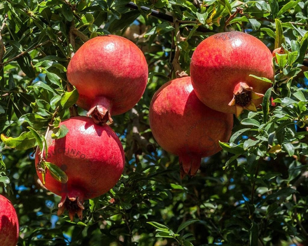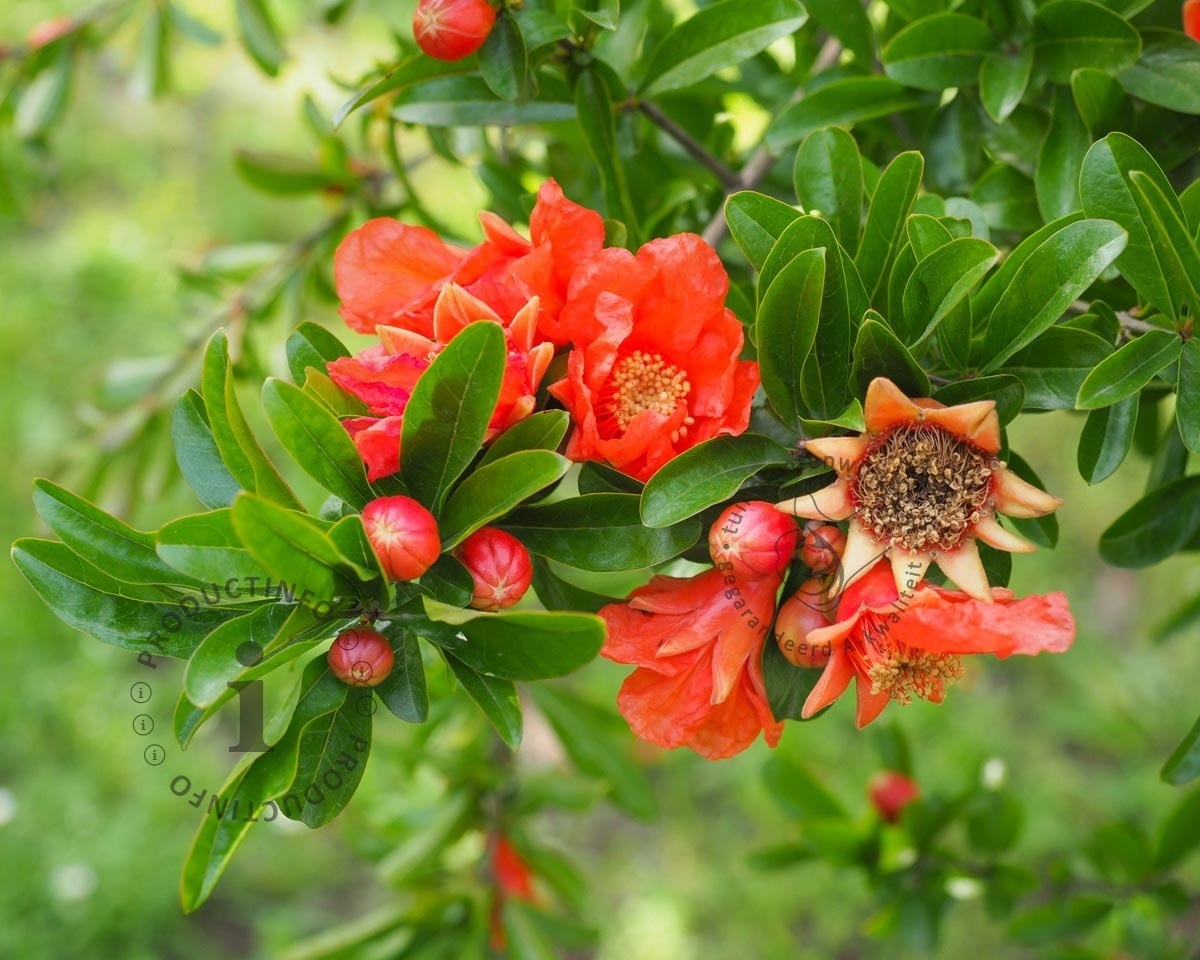 Punica granatum - halfstam bloeit gedurende gehele zomer met felrode bloemen, waaraan na de bloei later de granaatappelen verschijnen. Daar is wel een lange, warme zomer voor nodig. De zoetzure vrucht bevat veel vitamine C. Als een rijpe vrucht op de grond valt, springen de zaden alle kanten op, vandaar de naam.