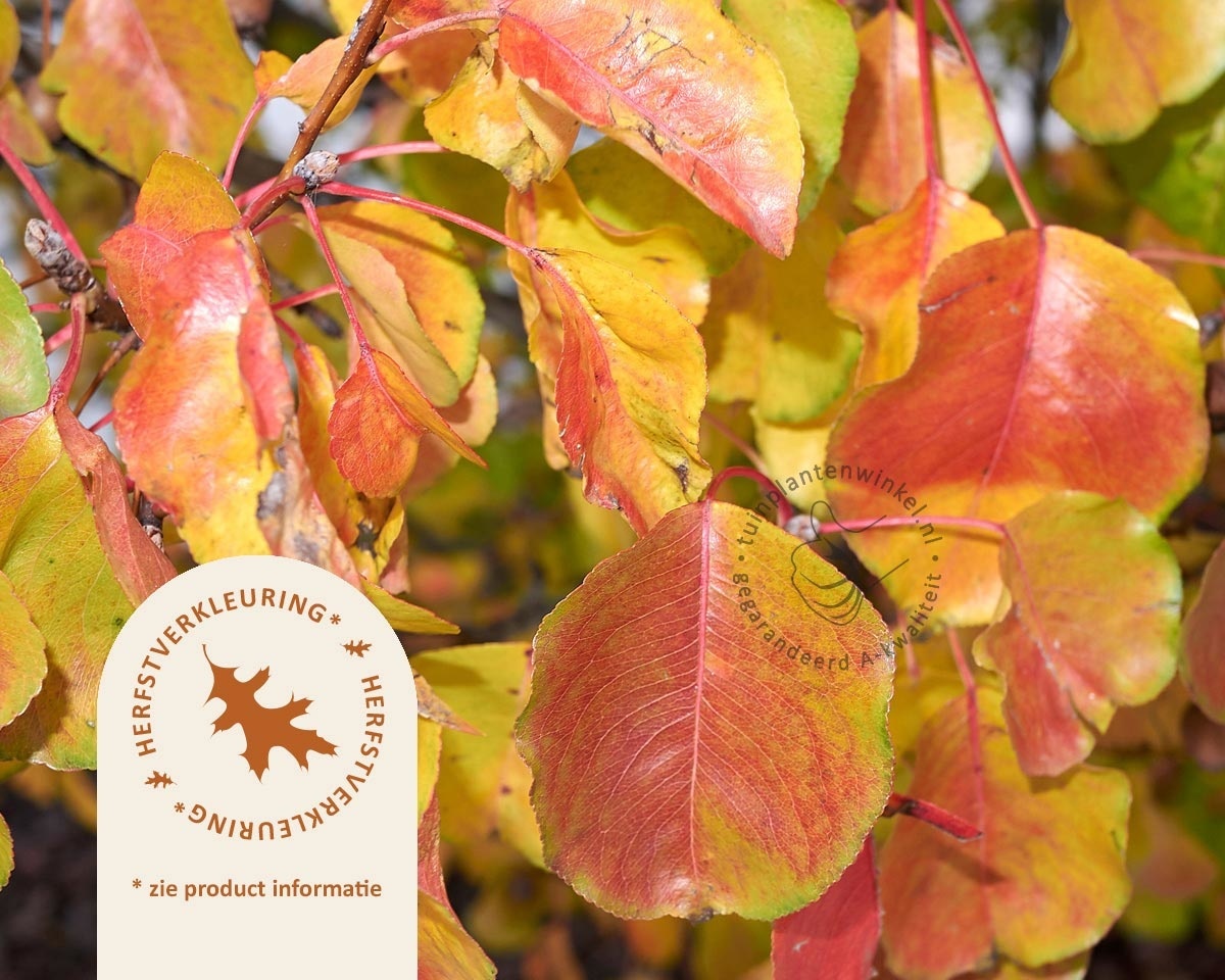 Het blad van Pyrus calleryana 'Chantinleer' verkleurt in het najaar. De kleuren op de foto geven een indicatie van deze verkleuring. De exacte verkleuring is afhankelijk van de standplaats en het weer en kan per jaar verschillen. Het is dus niet zeker of u de verkleuring zoals deze gefotografeerd is, ook terugziet in uw tuin. Aan de kleuren die op deze foto zichtbaar zijn, kunnen geen rechten worden ontleend.