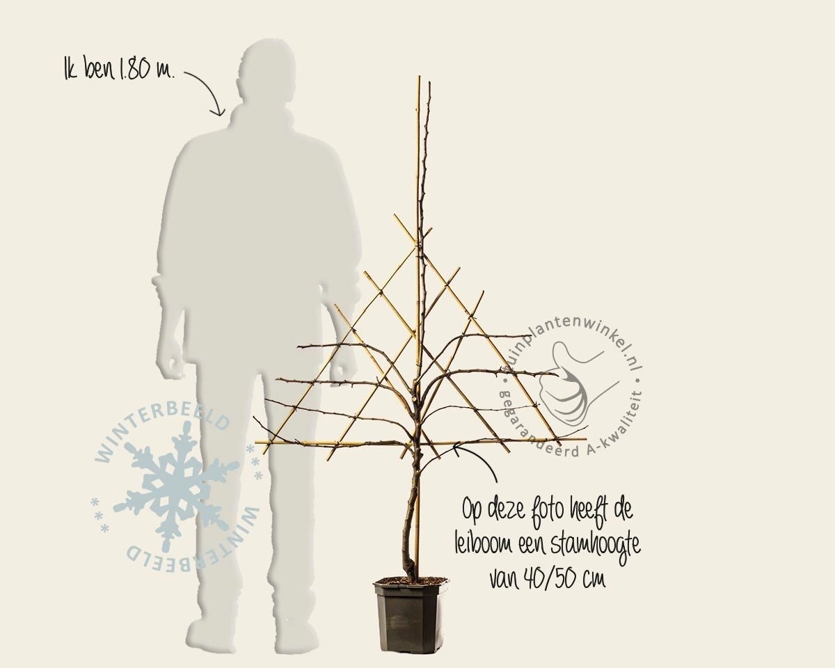 Wanneer er geen ruimte is voor een gewone fruitboom, kan een leifruitboom een goede oplossing zijn om toch te kunnen genieten van eigen gekweekt fruit! We bieden de leifruitbomen aan in diverse stamhoogtes zoals laagstam leifruit en halfstam leifruit. De stamhoogte wisselt, kijk daarom bij de productspecificaties voor de geleverde stamhoogte. Laagstam zit meestal rond de 50 cm stamhoogte, halfstam zit meestal rond de 120 cm.