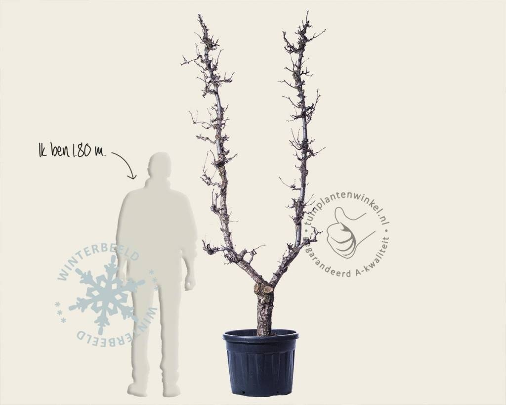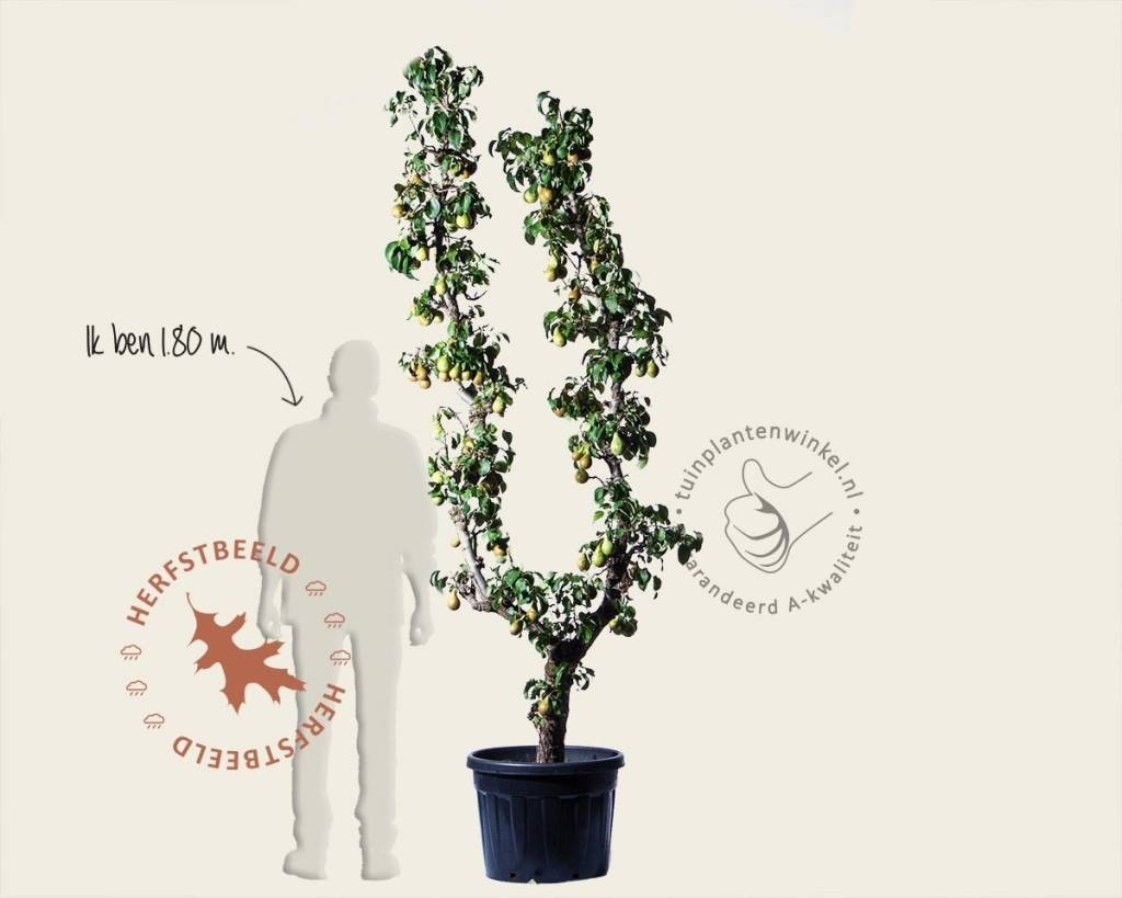 Met deze Perenboom heeft u wat unieks in de tuin. De bijzondere U-vorm zorgt ervoor dat ook in kleinere tuinen een fruitboom kan staan. De boom kan bijvoorbeeld ook goed tegen een warme muur geplant worden. De U-vorm ziet u terug in de 2 verticale hoofdtakken die van onder uit de stam komen en breed als een U uitlopen.