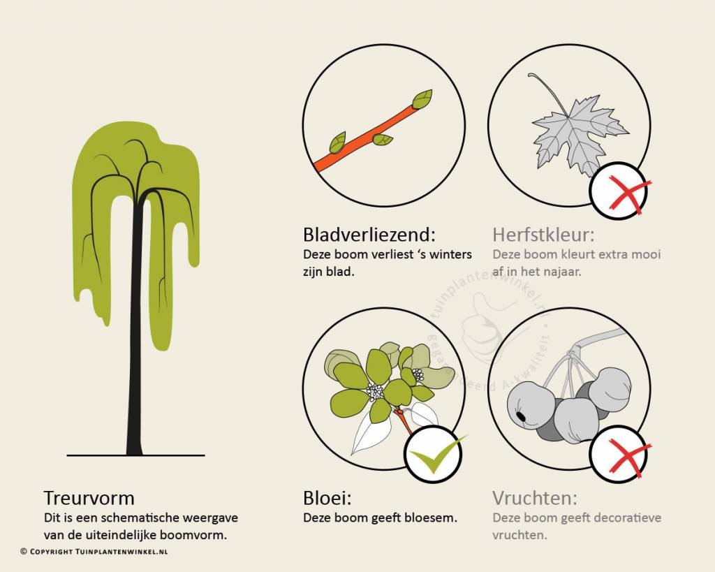 Dat grijs ook een hele mooie, uitgesproken kleur kan zijn, bewijst Pyrus salicifolia 'Pendula' wel! Zijn dunne, grijze, afhangende twijgen met daaraan de zilvergrijze, viltig behaarde bladeren geven uw tuin kleur en een chique uitstraling. De bloemen verschijnen in het voorjaar en zijn crèmewit. De Sierpeer of Wilgpeer blijft lang in zijn blad zitten. Het is een mooie boom op stam om als solitair in de tuin te gebruiken.