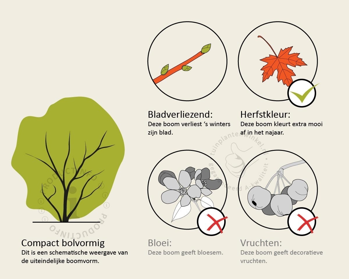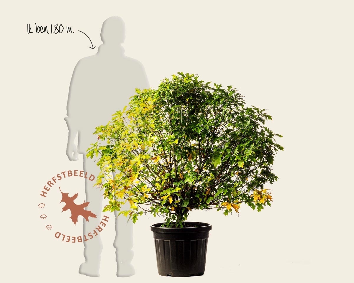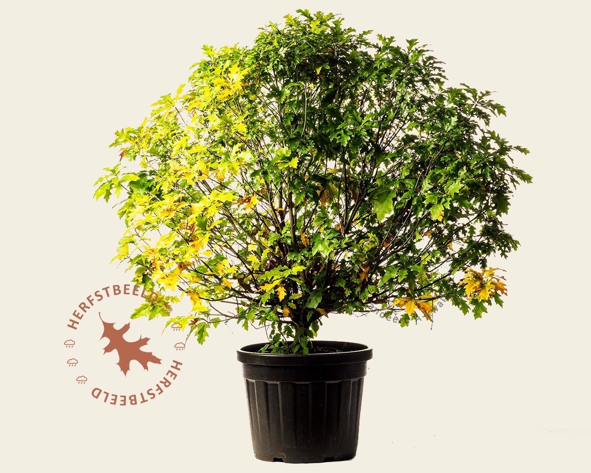 Het blad van de tuinplant verkleurt in het najaar. De kleuren op de foto geven een indicatie van deze verkleuring. De exacte verkleuring is afhankelijk van de standplaats en het weer en kan per jaar verschillen. Het is dus niet zeker of u de verkleuring zoals deze gefotografeerd is, ook terugziet in uw tuin. Aan de kleuren die op deze foto zichtbaar zijn, kunnen geen rechten worden ontleend.